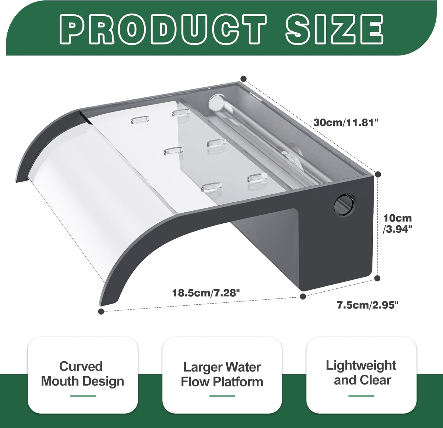 - ăUpdated Curved Open Lipă- Unlike other narrow, short waterfalls, our updated pond waterfall features an integrated 8-inch wide water platform and 4-inch high water storage tank platform, and curved open lip. This wider, longer design creates a stable, smooth stunning water flow, so you can better enjoy the soothing sights and sounds of the cascading water. Waterfall does not include LED lights. Purchase them in our store.