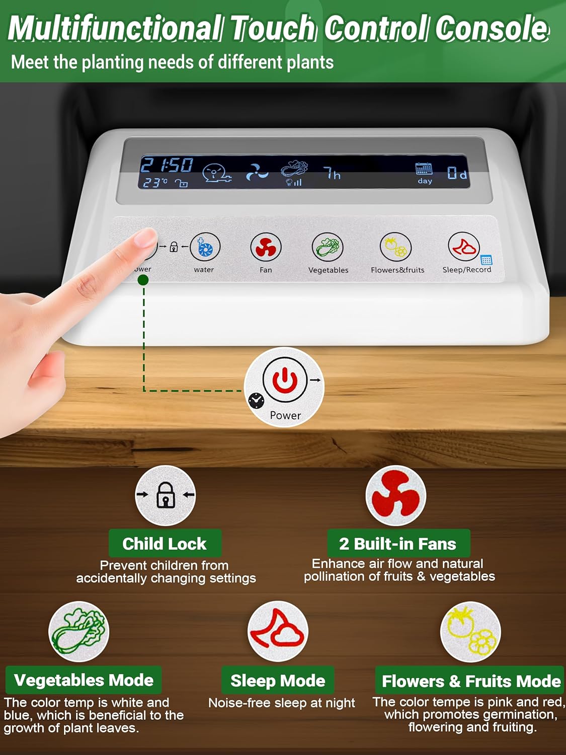 - 【Sleek Design & User-Friendly】 The Growell hydroponics growing system kit features a large 5.4-inch screen that provides clear and comprehensive data on your hydroponic setup, giving you full control over your plant growth. With its straightforward button settings, even beginners can operate it with ease. Plus, our child lock mode keeps curious kids from accidentally interfering with your hydroponic system settings.
