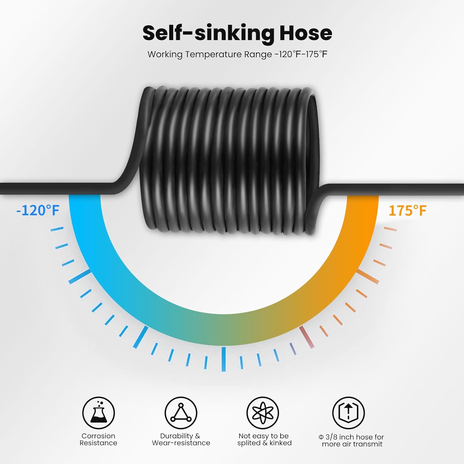 - 3/4 HP Air Compressor β Highly efficient and quiet 3/4 HP oil-free Rocking Piston Air Pump, with maximum 5.2 CFM air volume and below 60DB low noise level, strong power to promote the underwater oxygen circulation