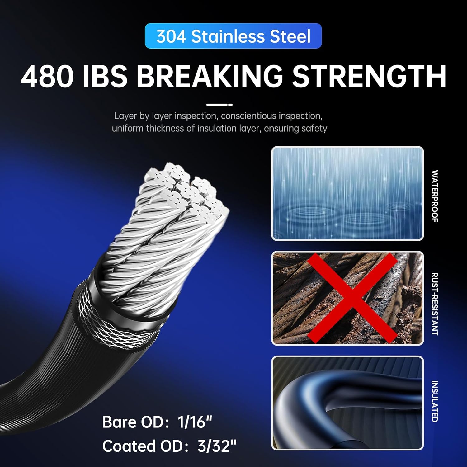 - Professional-Grade 304 Stainless Steel Construction:Featuring 7x7 galvanized steel core with 480lbs break strength, our steel cable withstands extreme weather (-40°F to 1000°F) and resists corrosion. The double-coated PVC layer ensures scratch resistance while maintaining flexibility for precise tension adjustment.