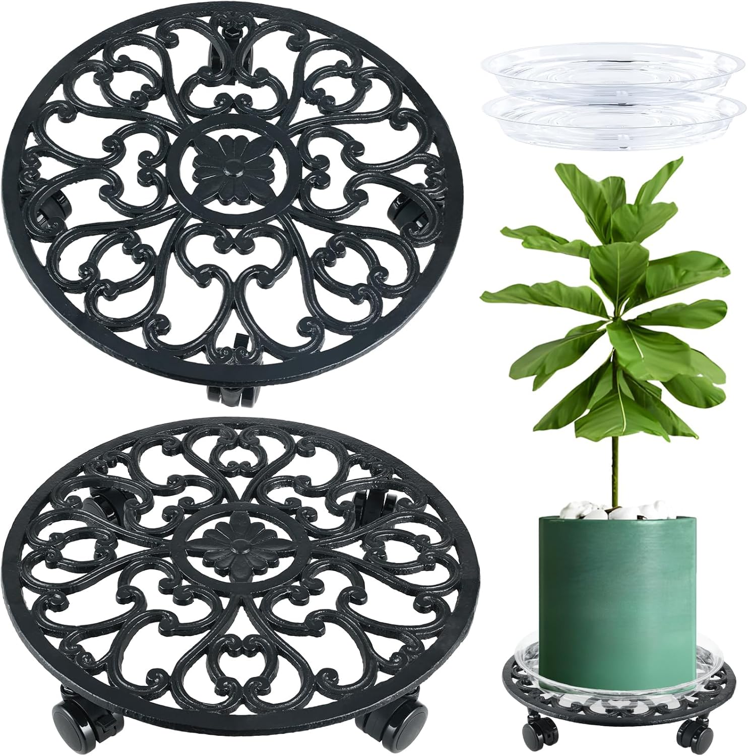 2 Packs 14 Inch Rolling Plant Stand with Wheels Metal Plant Caddy with Wheels Heavy Duty Round Plant Stand Indoor Iron Plants Rollers for Plants, Plant Dolly with Plant Saucers