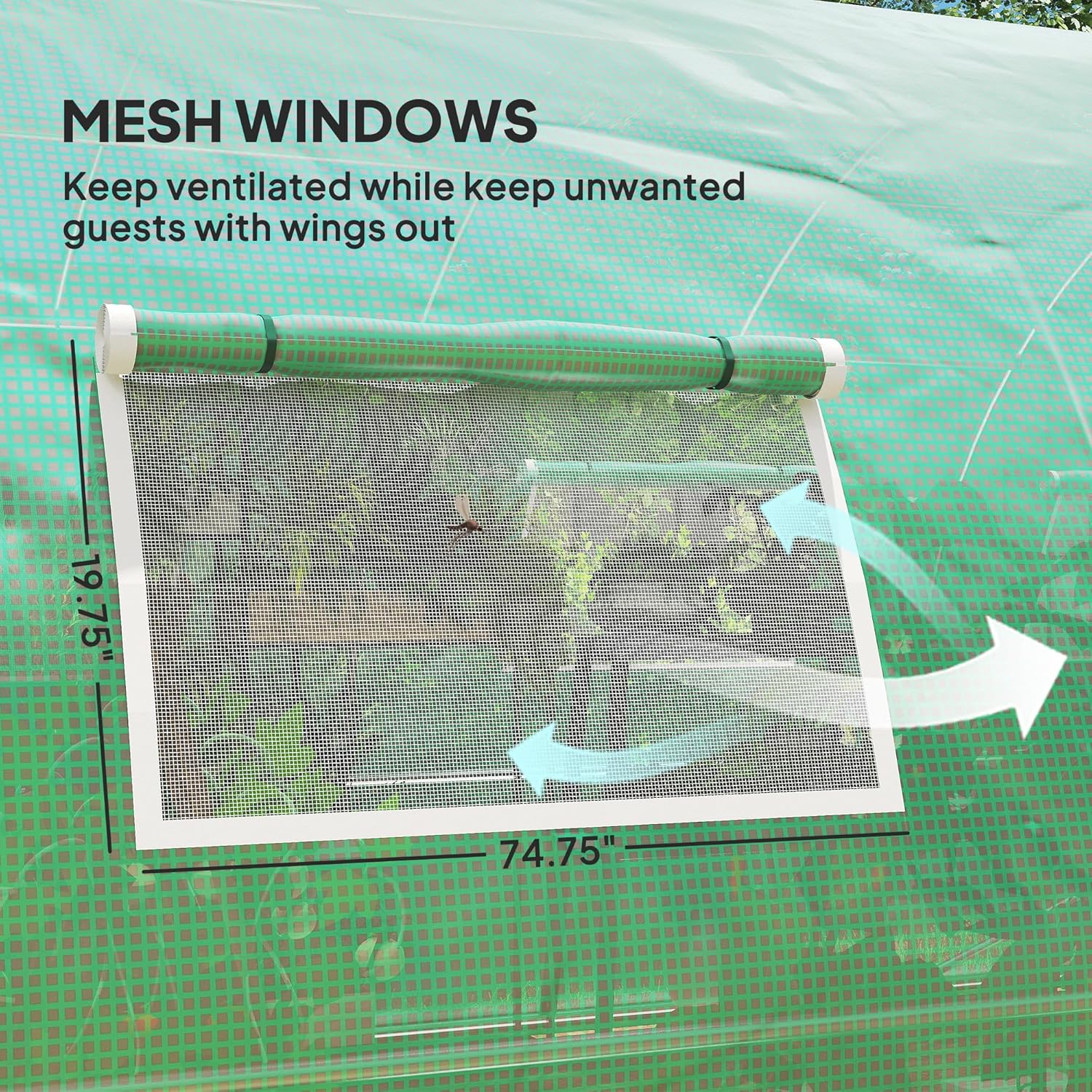 - Windows & Doors: Enjoy easy access to your outdoor greenhouse with hinged doors large enough to walk in and out with supplies. For more fine-tuned ventilation, open the 8 windows so heat and humidity are in your hands. They're mesh-protected, keeping unwanted winged things away.