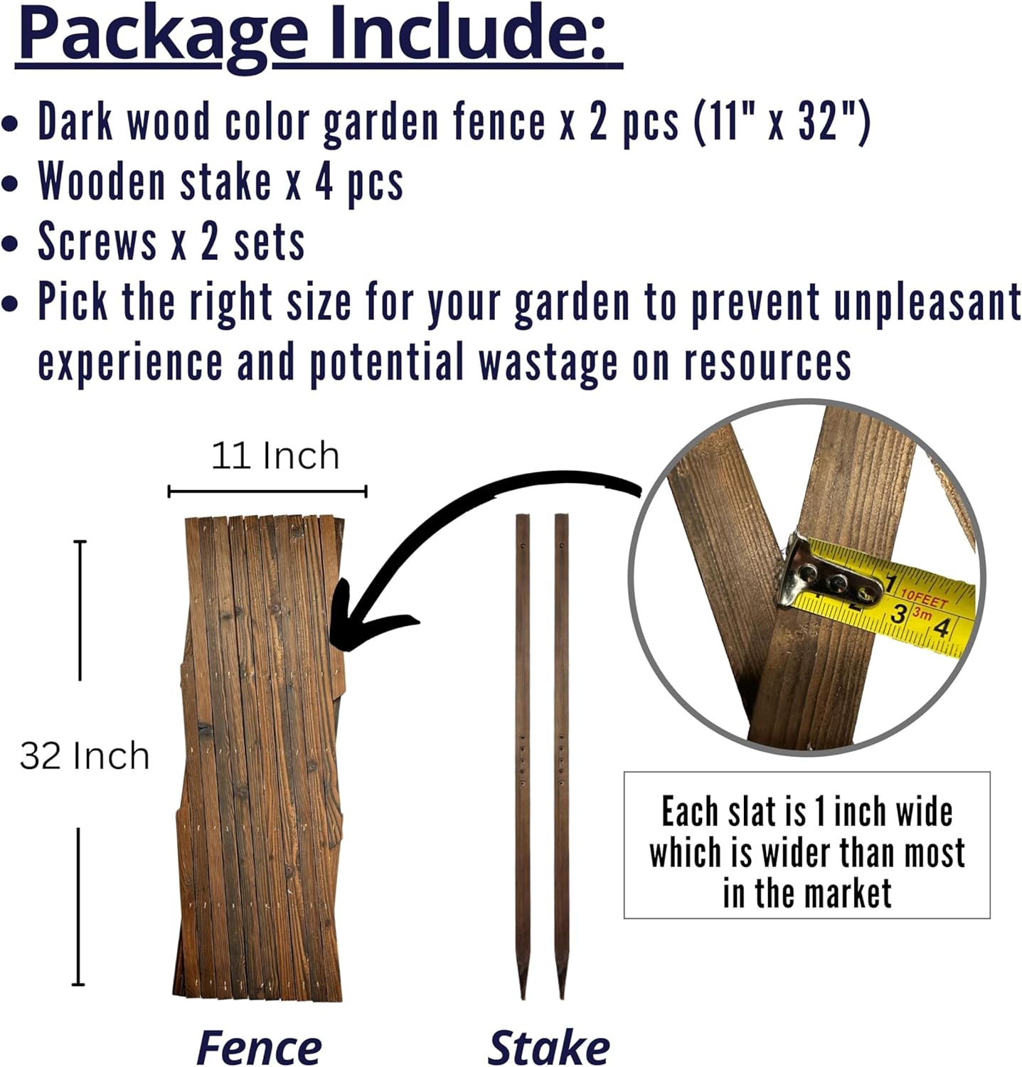 - SIZE DIMENSION: 2 Pack (Total 12 ft) - This expandable trellis can adjust to the length and height according to your special uses. The 2 packs package included Dark Wood color garden fence x 2pcs, wooden stake x 4pcs and Screw x 8sets.