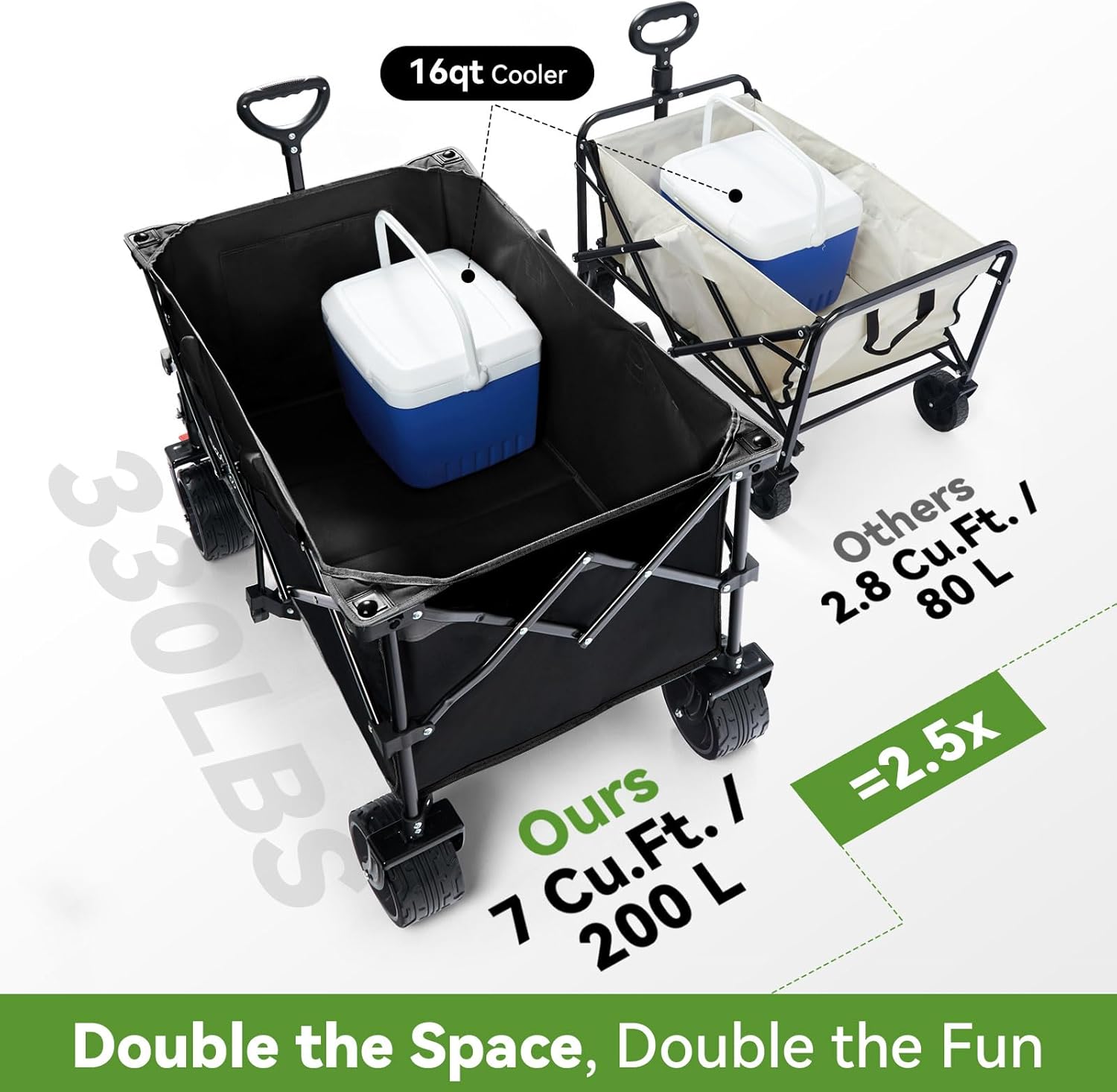 - šššššš, ššššš ššššššš ā You could hardly find a larger one. Our beach wagon with surprisingly enlarged capacity of 7 cubic feet / 200L is designed to be a real carryall. With a deeper and larger storage space, our wagon cart features 3-4 times the capacity of a 24-inch suitcase or 5-7 times of a 20-inch suitcase. Just load it with everything you need and enjoy a nice adventure in the sun!