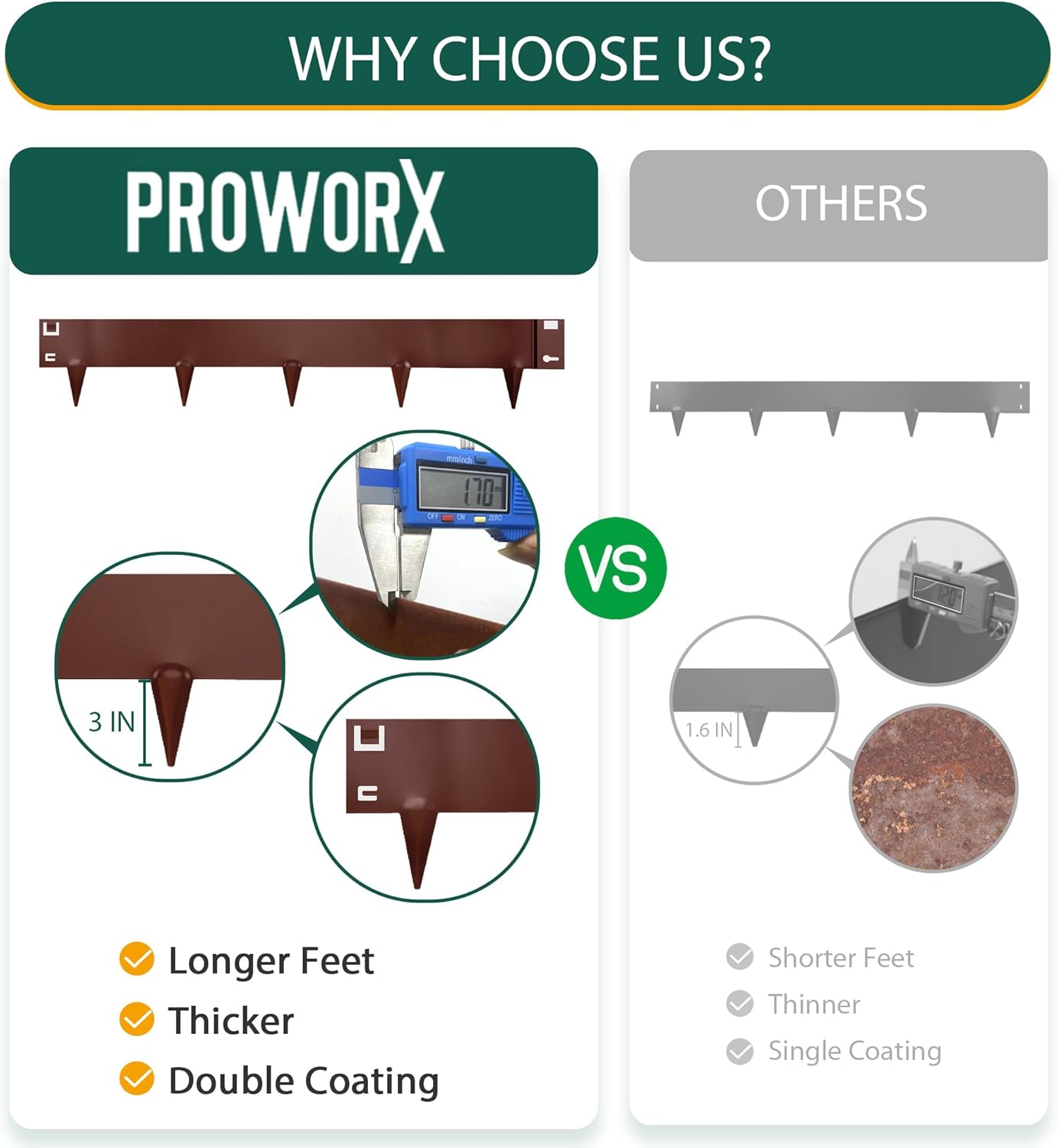 - Easy Installation: Each piece of PROWORX 7 in high by 42 in long steel landscape edging easily presses into the ground with 3 in spiked feet, and a mallet can be used when necessary for a firm installation