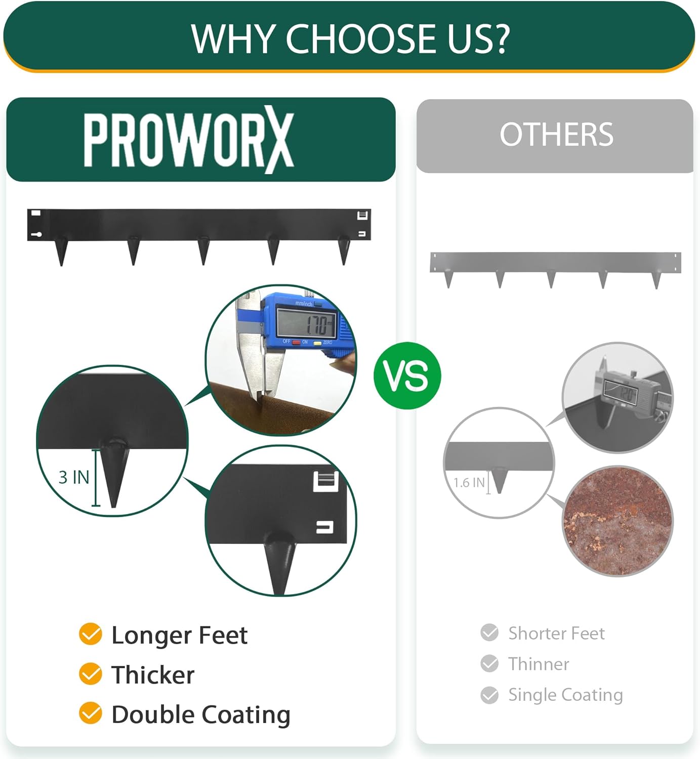 - Easy Installation: Each piece of PROWORX 7 in high by 42 in long steel landscape edging easily presses into the ground with 3 in spiked feet, and a mallet can be used when necessary for a firm installation
