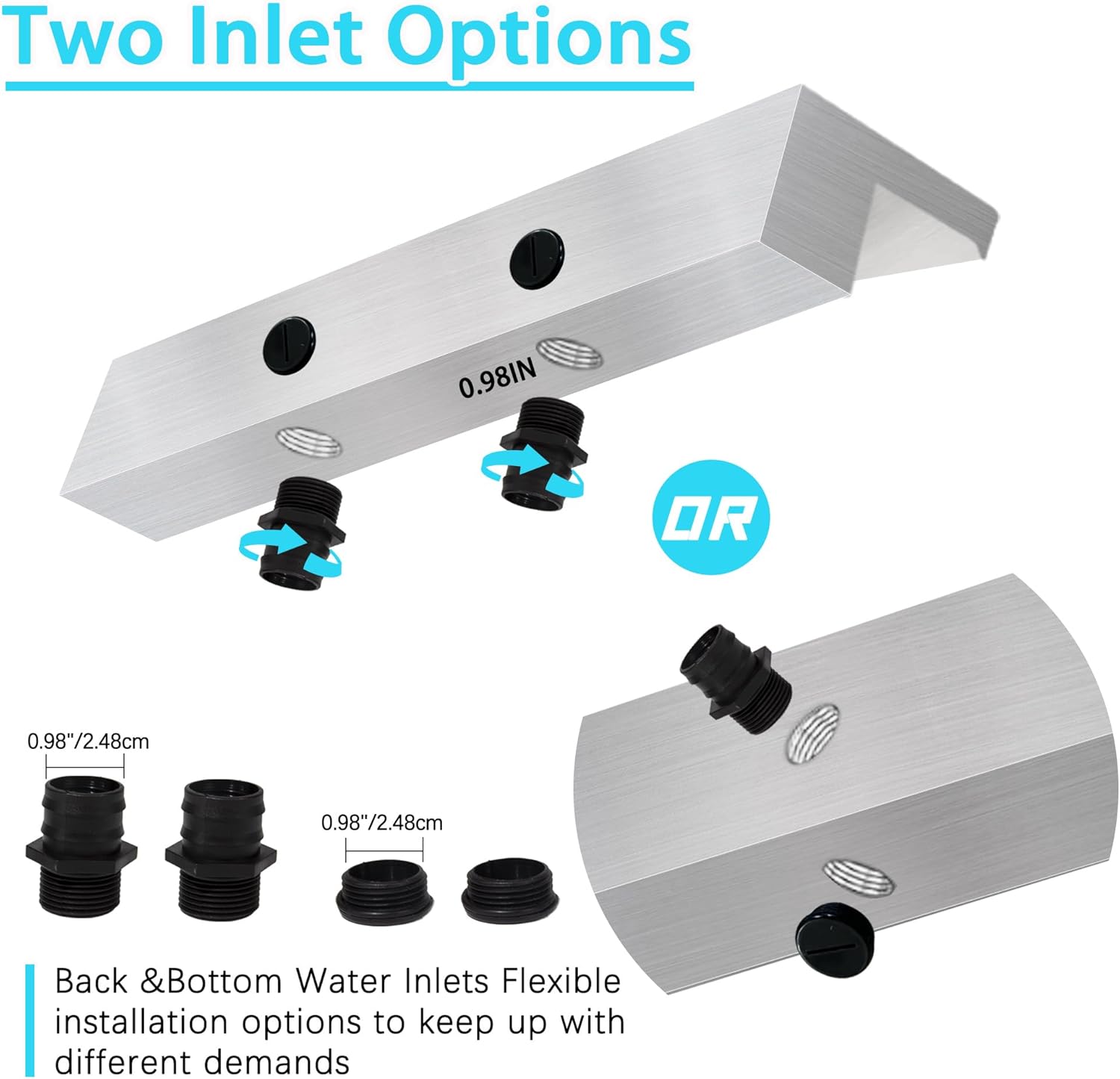 - Unlimited DIY Installation:There are two options for pipe installation , install on both the back and bottom by your mind . Also, three methods for choice : embedded installation and external waterfall installation and external wall fixed installation, which can be suitable for different areas to install, such as garden, patio, pool, rockery etc