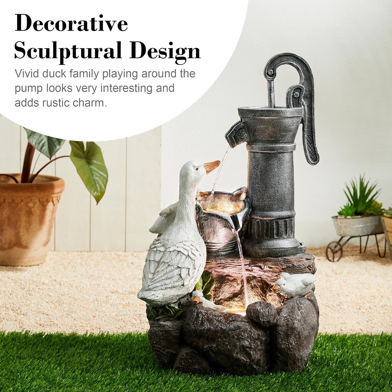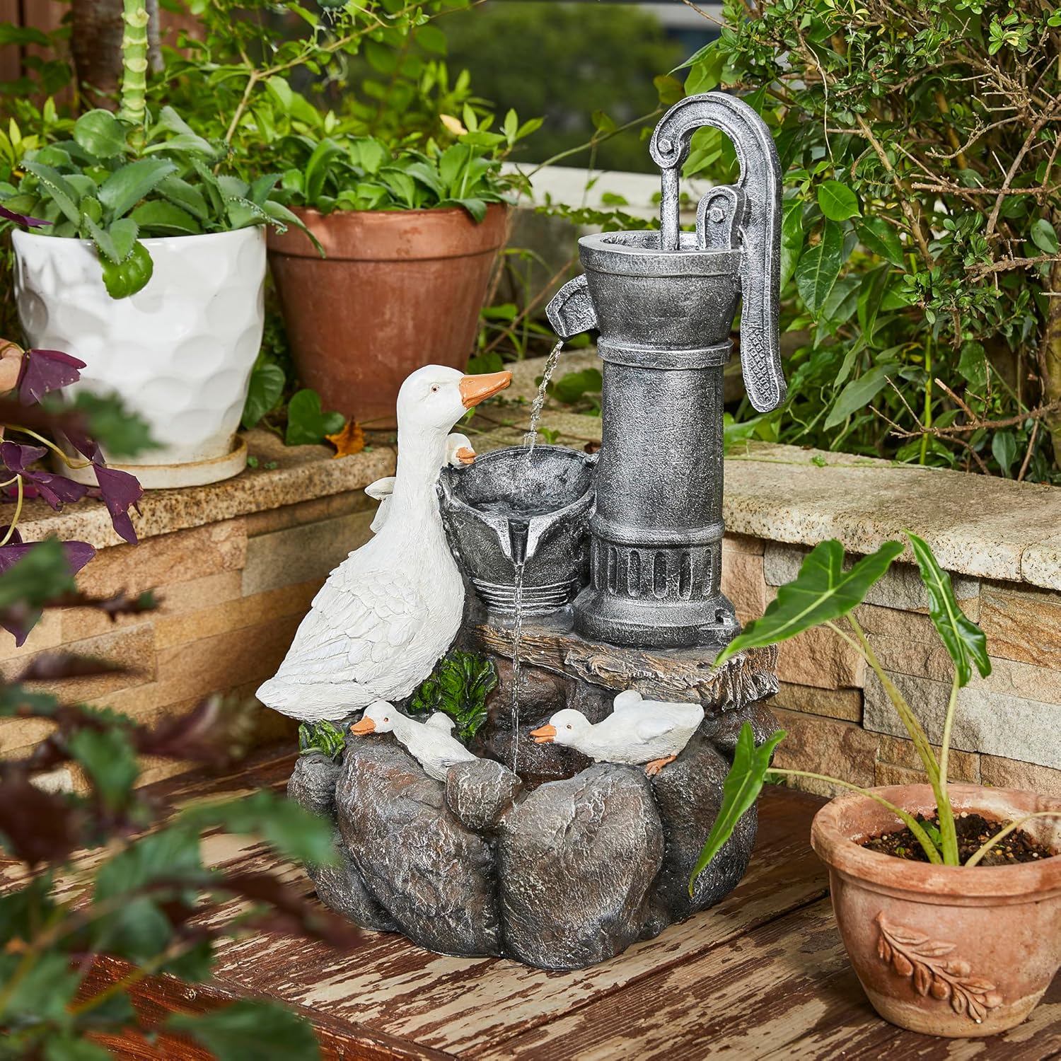 - Durable & Stylish Polyresin Outdoor Fountain --- This durable, weather-resistant duck water fountain. Made from a sturdy blend of polyresin and stone powder, it’s built to withstand harsh outdoor conditions while maintaining its beauty season after season. The lifelike stone texture and gentle water flow create a calming atmosphere while complementing any outdoor decor.