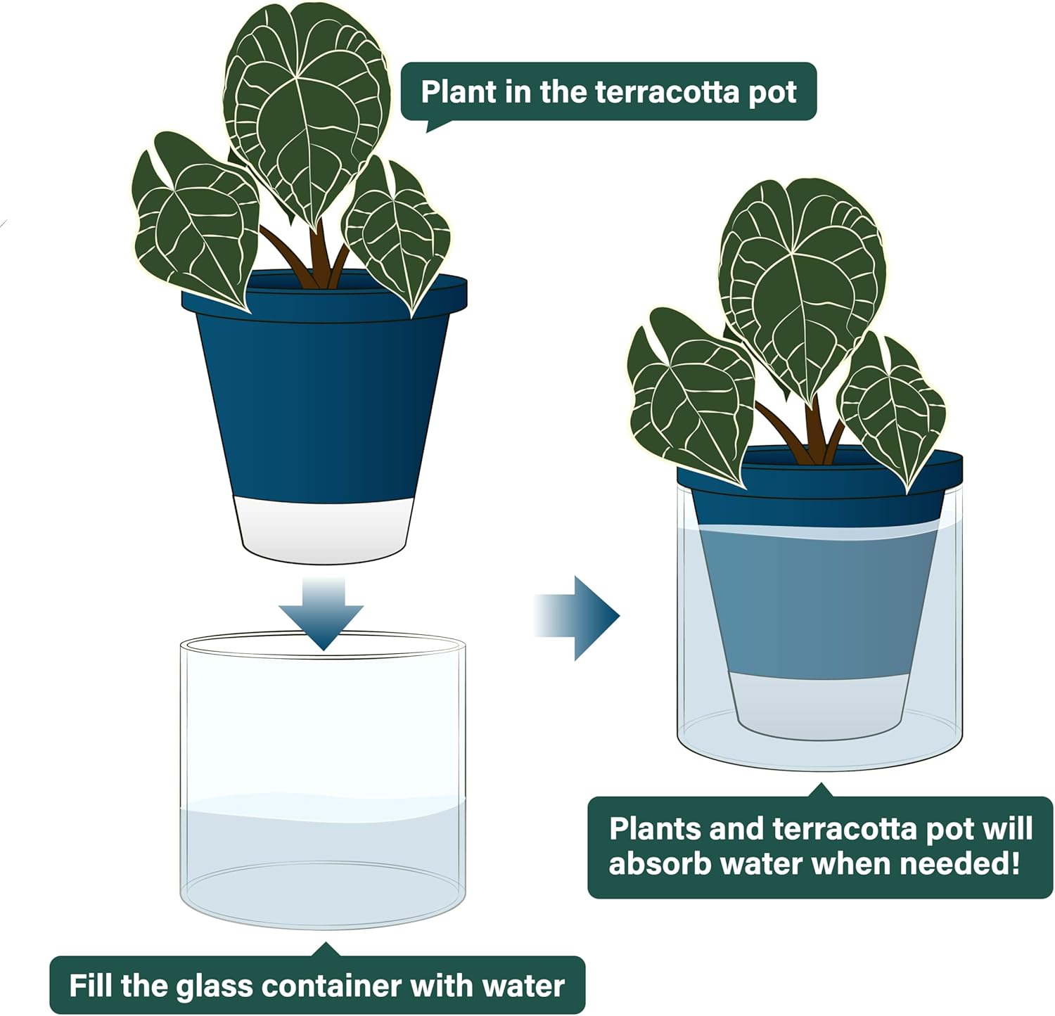 - Innovative Self-Watering Design: The bottom quarter of the terracotta pot is unglazed, just fill the glass container with water to ensure plants will absorb only what they need through the terracotta pot walls.