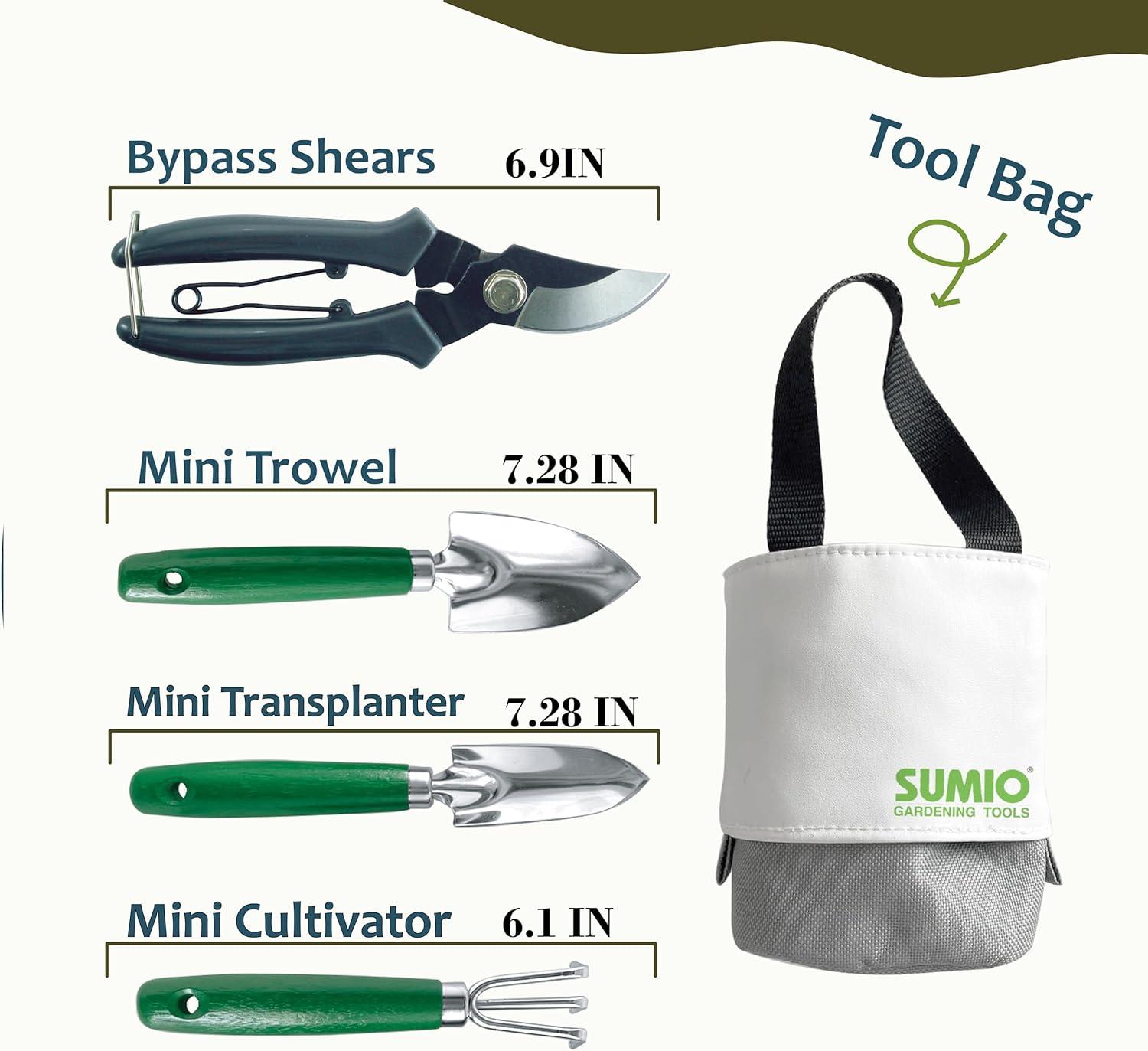 - 4-piece tool set: includes MINI TROWEL, MINI TRANSPLANTER, MINI CULTIVATOR, and BYPASS SHEARS. This versatile set comes with a convenient storage bag, making it perfect for a variety of delicate indoor or tabletop gardening needs.