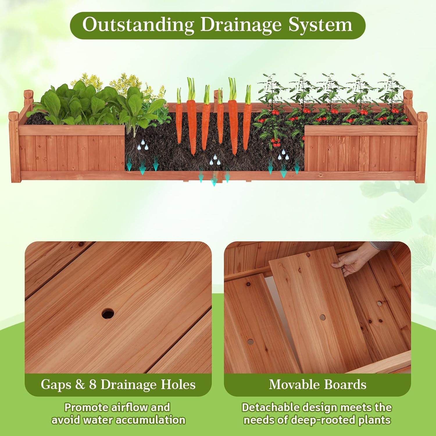 - 【Premium Fir Wood Material】 Crafted from high-quality natural fir wood, our garden box features an attractive natural wood grain that adds to the overall aesthetic appeal of the garden with minimal ecological impact. In addition, the smooth planter surface is coated with a waterproof coating for an excellent outdoor durability and allows for extended service life.