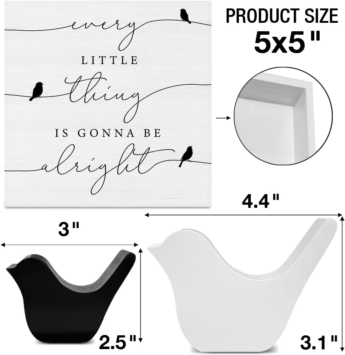 Every Little Thing is Gonna Be Alright Birds Wooden Box Sign Farmhouse Wood Box Sign Spring Art Blocks Desk Shelf Tabletop Home Decor (with 2 Wood Bird Statues)