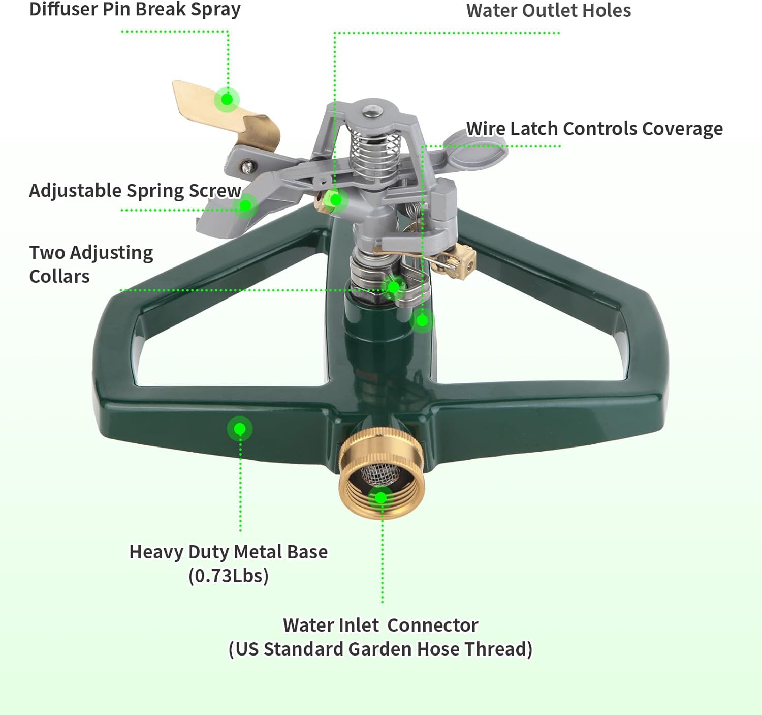- 【Heavy Duty Base Design】: Smooth zinc alloy paint surface ensures the lawn sprinkler's corrosion and wear resistance for many years. The sprinkler system's modest weight and sturdy construction provide unparalleled reliability, with additional ground studs designed to prevent any accidental tipping.