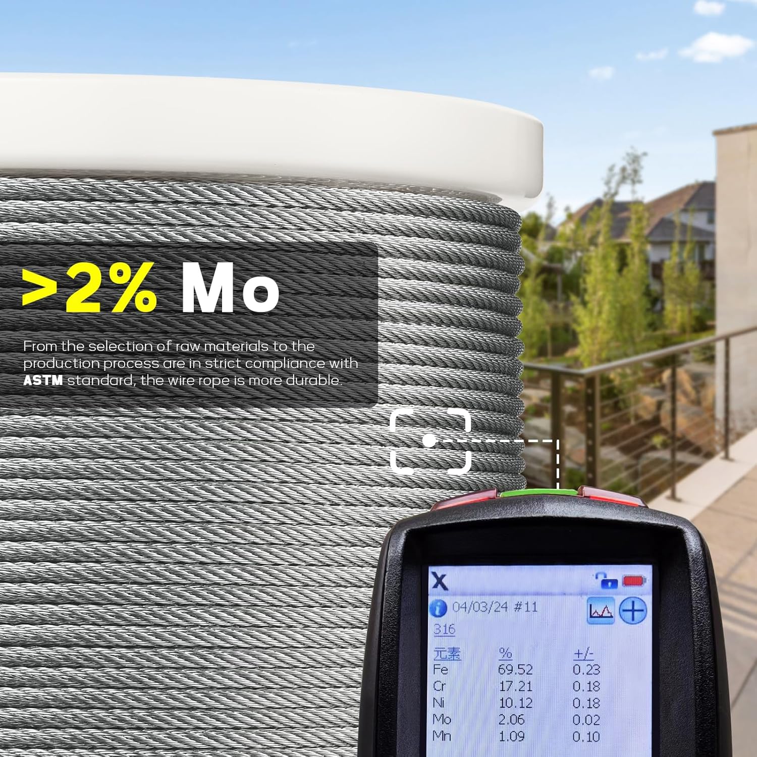 - High-quality 316 Stainless Steel: Manufactured from ASTM standard marine-grade 316 stainless steel with 2% molybdenum, our steel cable has excellent corrosion resistance and rust resistance, ensuring first class durability even in high-salt coastal areas and chlorine-rich environments like swimming pools