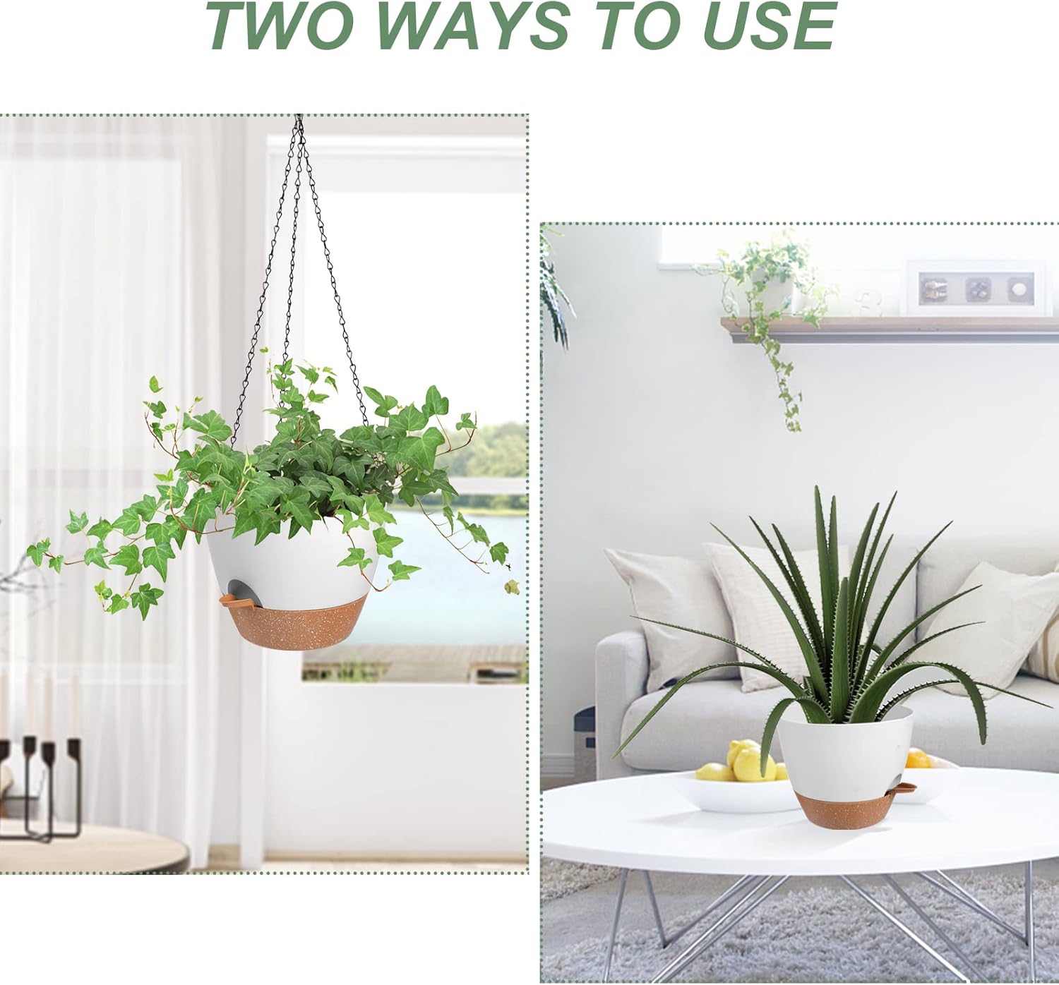 - Self Watering Planters Unique Style Design - The appearance and structural design of the self watering hanging planters for indoor plants are conducive to plant growth, and are suitable for matching various hanging plants. Such as ivy, herbs, ferns, philodendrons, succulents, flowers or other plants. Please Note: Plants NOT included.