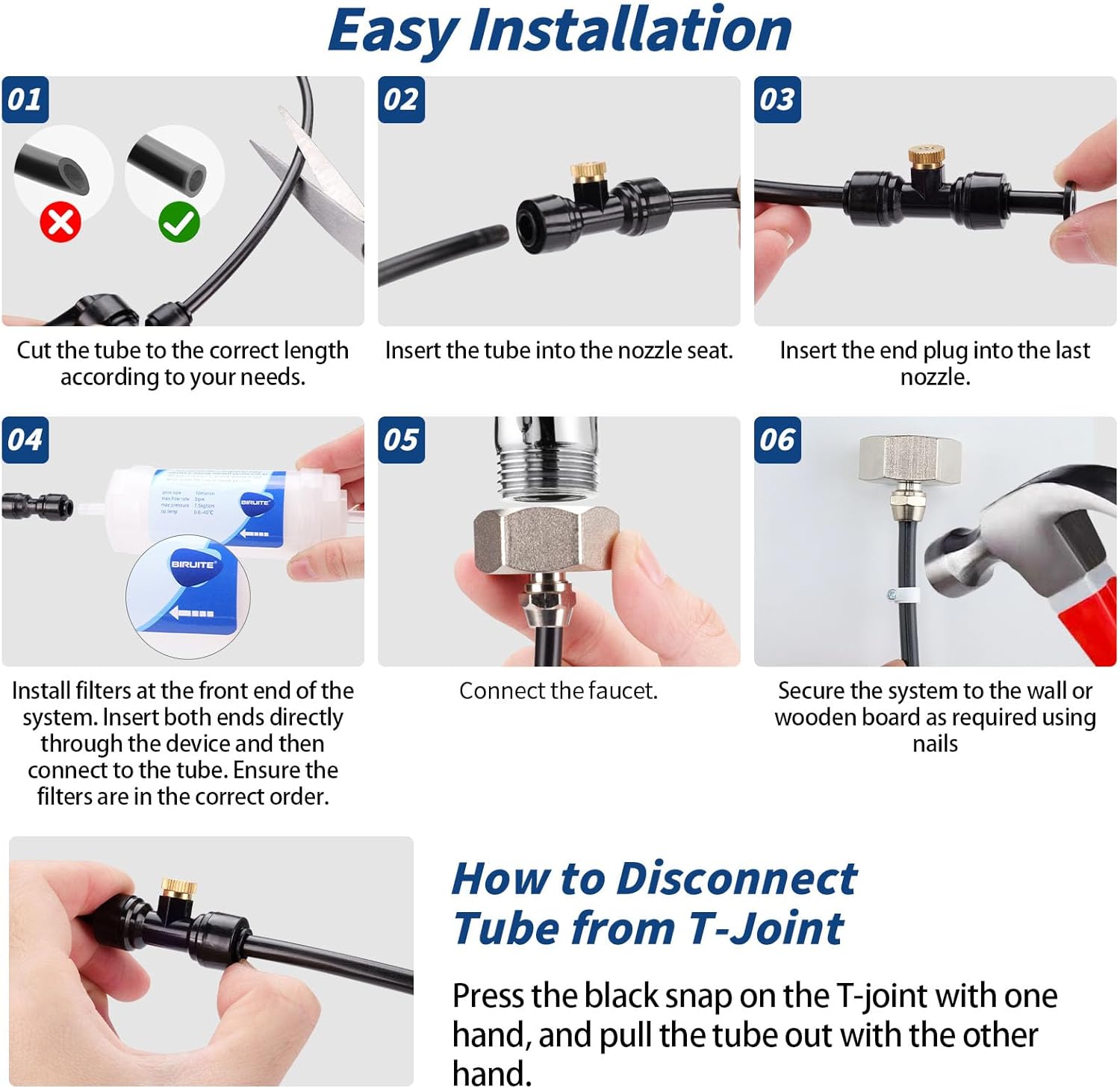 - 【High-Efficiency Mist Cooling】 Featuring a robust solid brass hose faucet adapter and precision misting nozzles, our system ensures an exceptional outdoor cooling experience. The durable black PU tubing resists UV damage, maintaining a leak-free, clog-free, and rust-resistant misting system for enduring use.