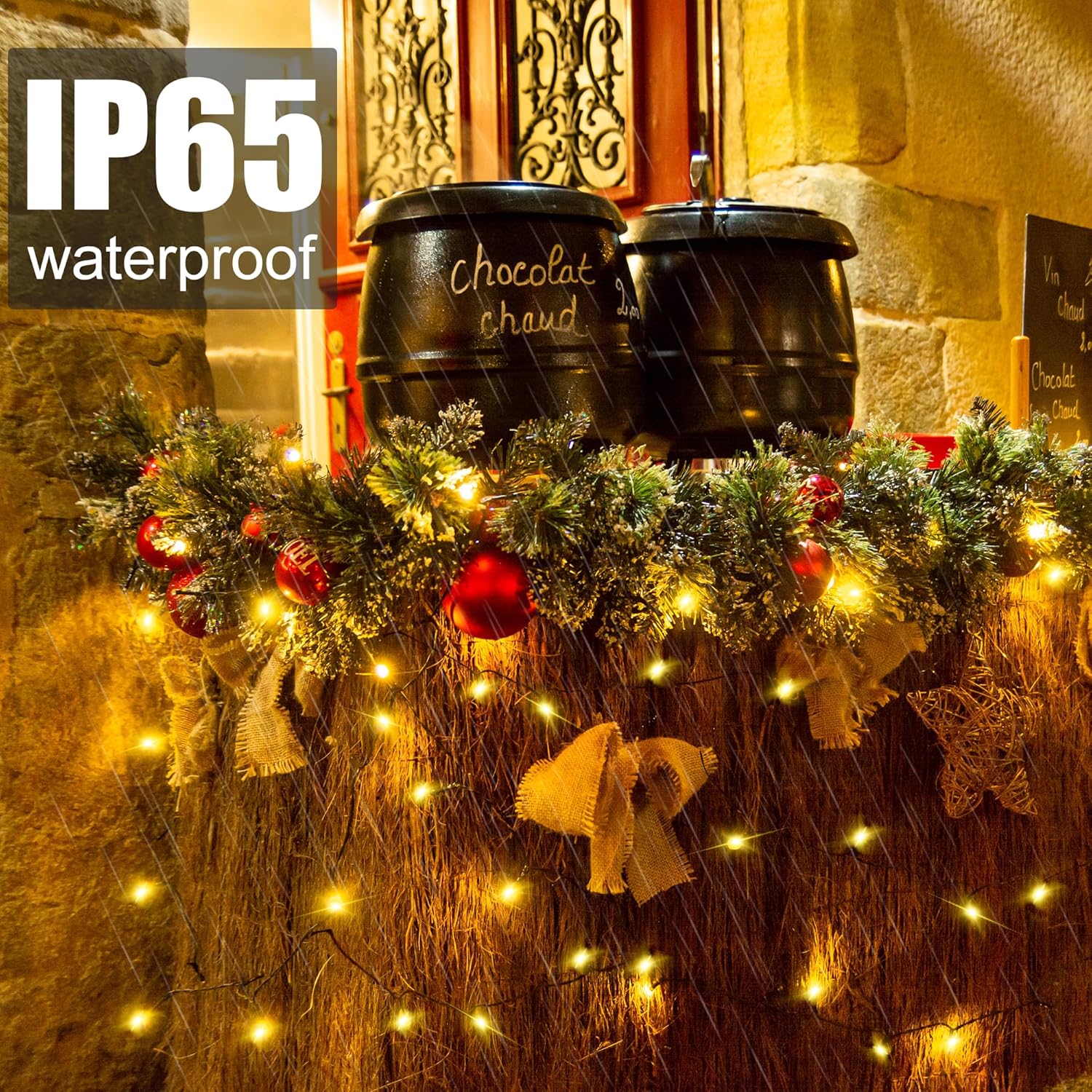 - [DIY Shape, Ideal Design]--The solar LED string lights is 32.8FT long, the LED lamp bead spacing is 0.33FT, and the lead length is 6.56FT, which can be easily installed wherever decoration is needed. At the same time, outdoor christmas lights have soft light cords that can be flexibly DIY designed into various creative shapes you want. They can also be wrapped around plants, stairs, courtyards, Christmas garlands and almost everything to create a charming atmosphere.