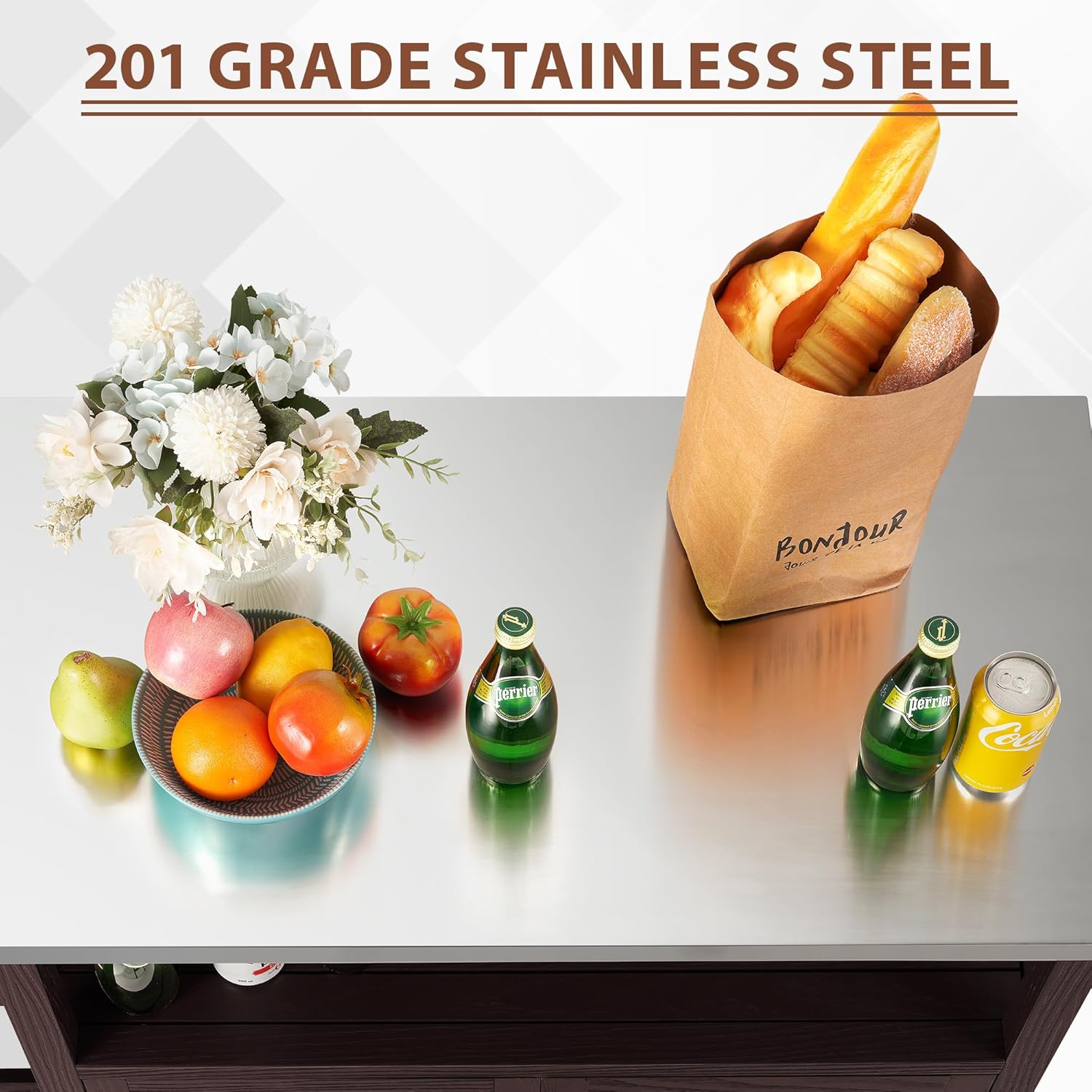 AHB Outdoor Grill Table Solid Wood Storage Cabinet, Rolling Kitchen Island, Movable Bar Cart with Stainless Steel Top for Outside Patio, Backyard, Garden (Two Doors)