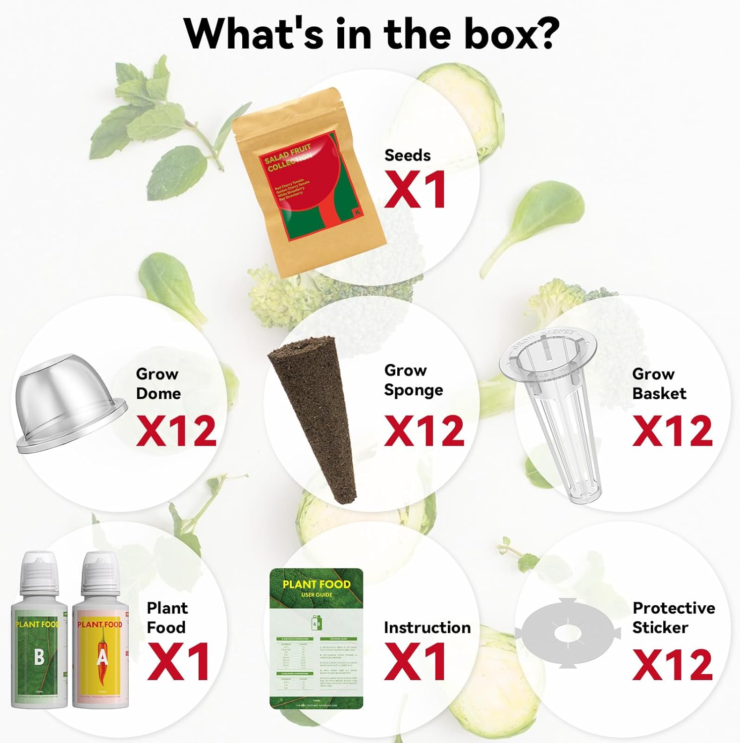 - Everything Your Need: inbloom hydroponic fruit seed kit not only includs red cherry Tomato, yellow cherry tomato, red strawberry, and white strawberry, but includes 12 grow baskets, 12 sponges, 12 domes, 12 protective stickers, and A&B plant food. Our fruit seed kits makes for a colorful garden with diverse flavors
