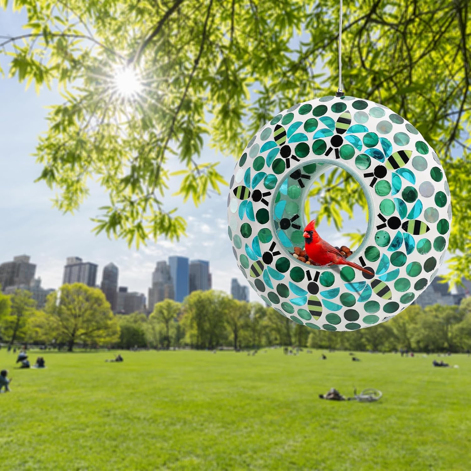 Yinns Bird Feeder - Fly Through Hanging Glass Large Bird Feeders for Outdoors Circle Wild Bird Mosaic Feeders Seed Container 9 inch