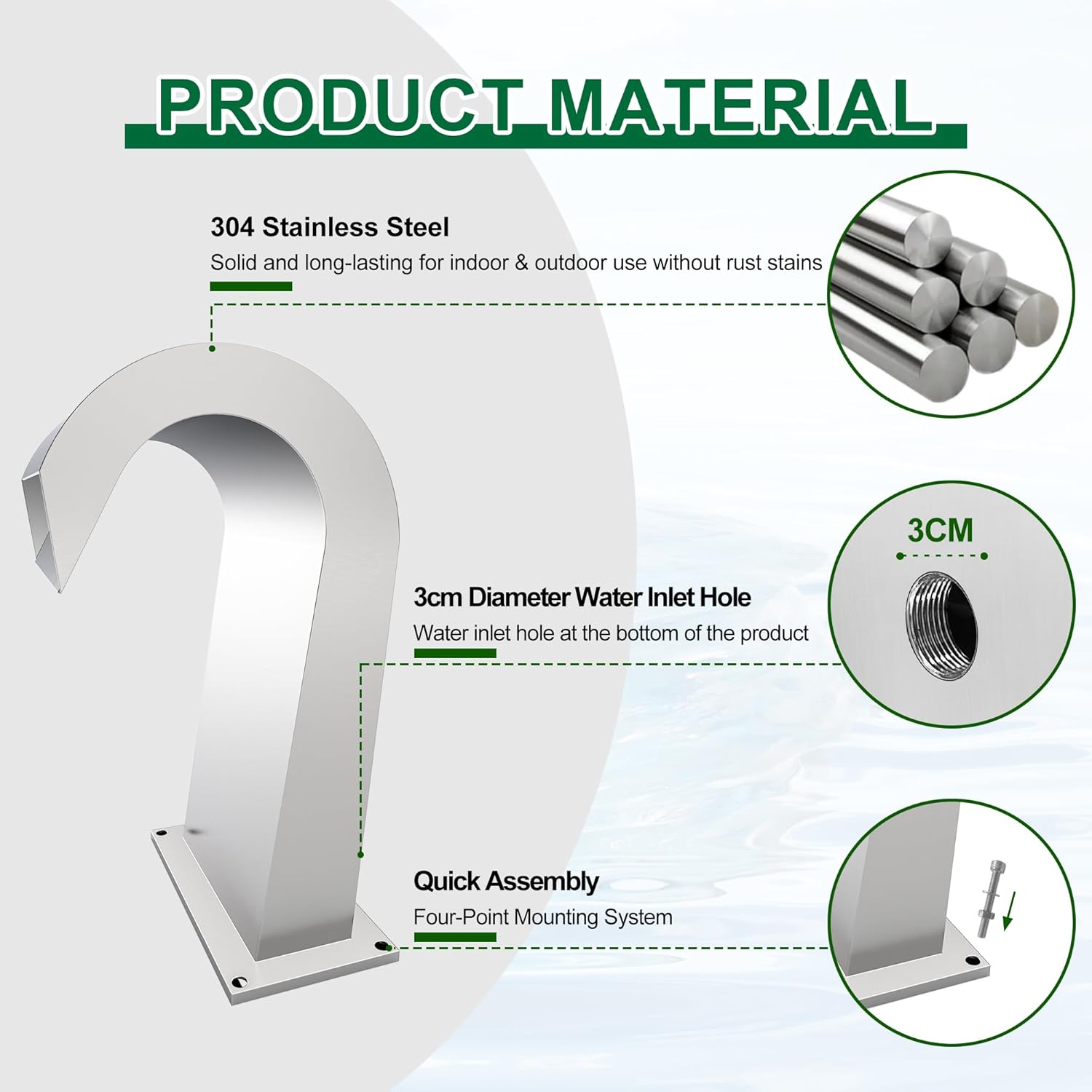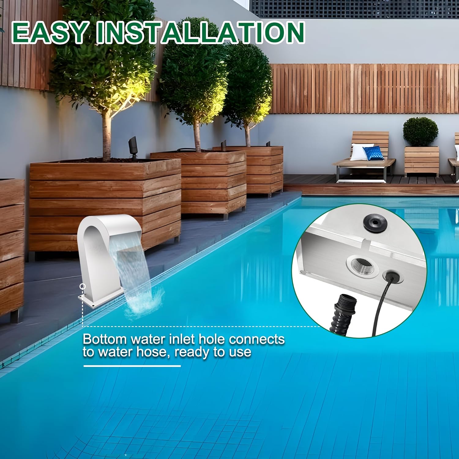 - One Year Replacement Committment: This elegant pool fountian requires a separately obtained pump for operation. We stand behind our products, and our dedicated support team is available to address inquiries regarding this product, offering prompt responses within a day. Please browse our other products for pool fountain accessories in our store. Waterfall only. LED light strips additional purchase.