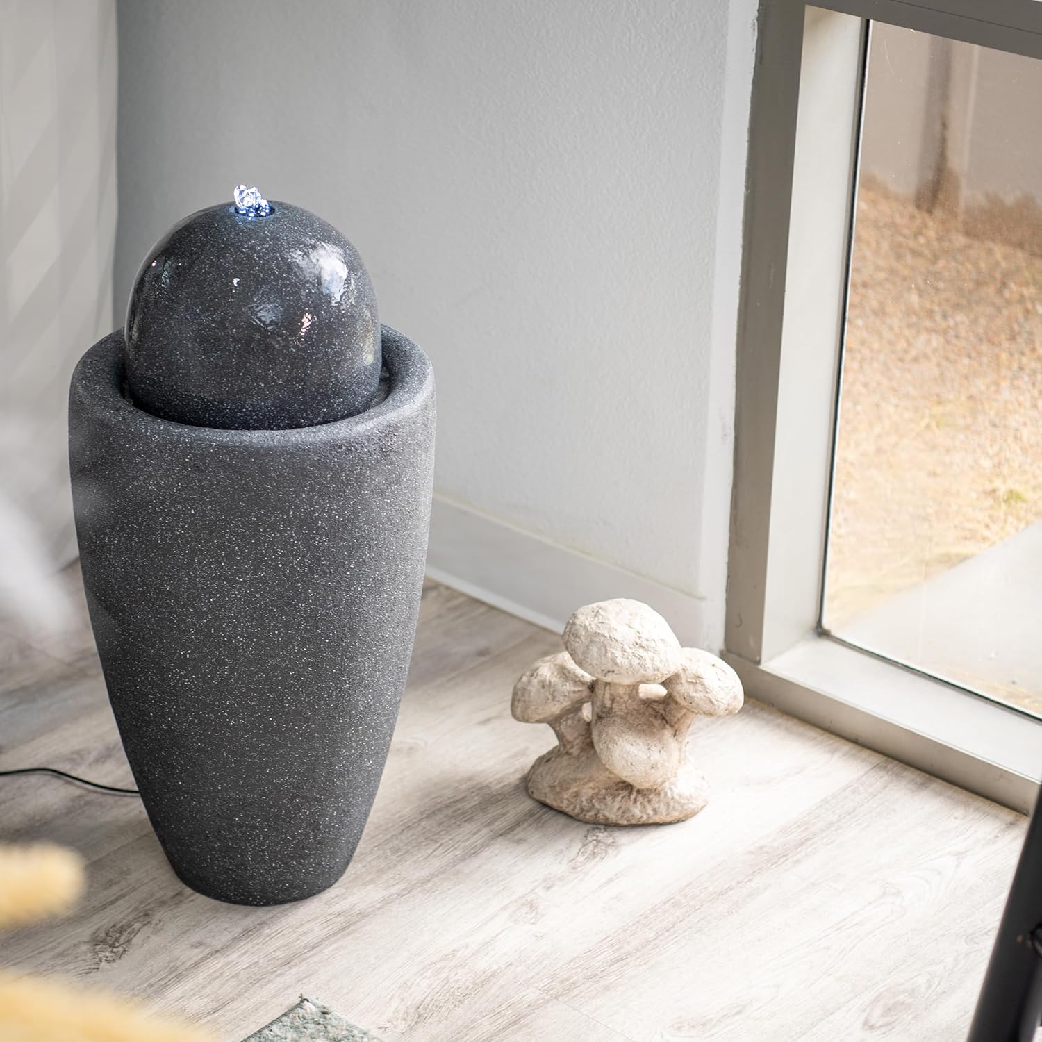 - GREAT SIZED AND LONG-LASTING: This ball water fountain decor measures 25.98"H x 11.81"L x 11.81"W, cord length 5 meters, made of durable Fiber Stone that ensures high quality for years. Also, water capacity of the fountain is 6.4 L.