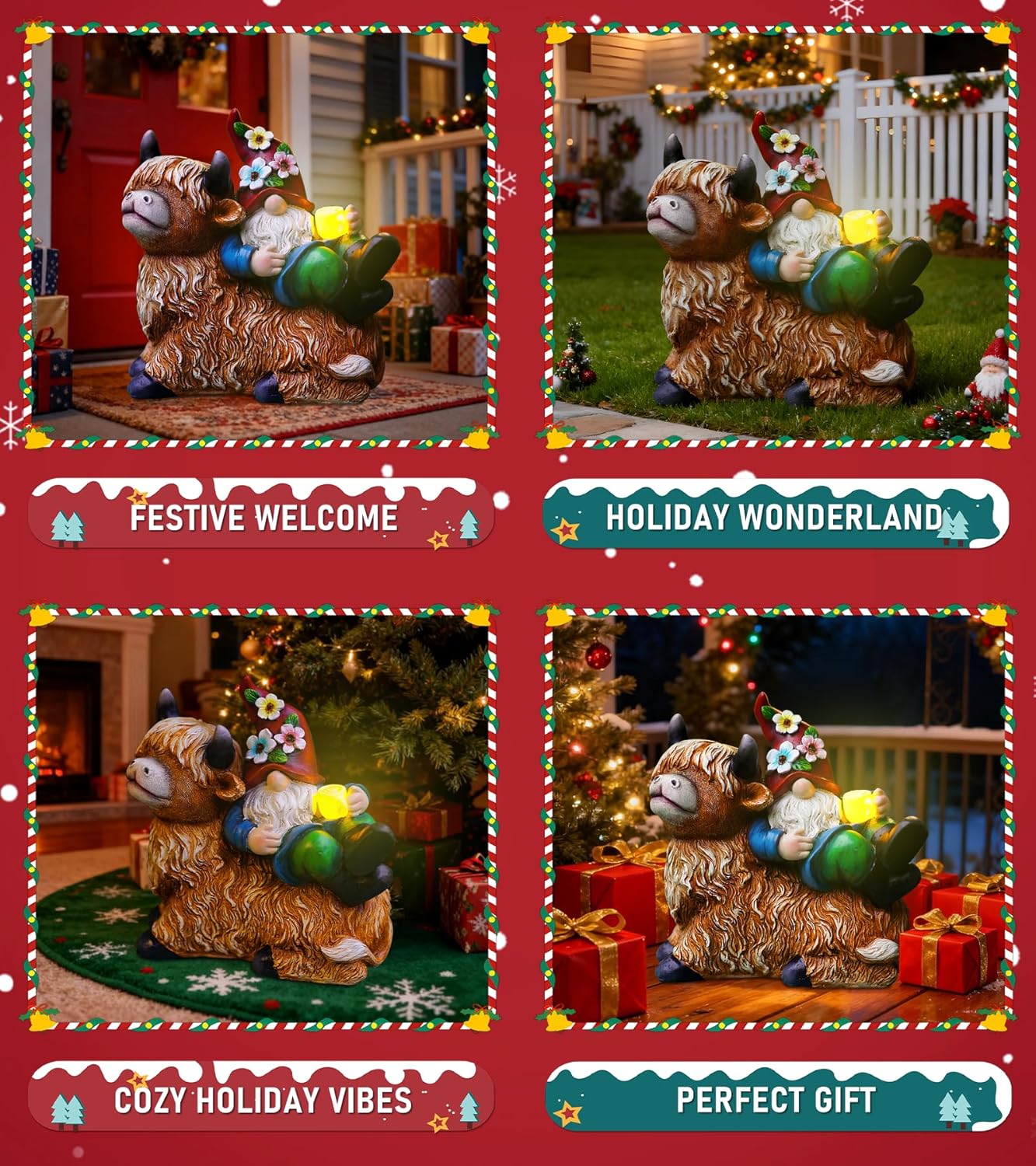 Garden Gnomes Decor Outdoor Statues Gnome on Highland Cow Hold Solar Cup Light Outdoor Decorations for Patio,Yard and Gift for Mom