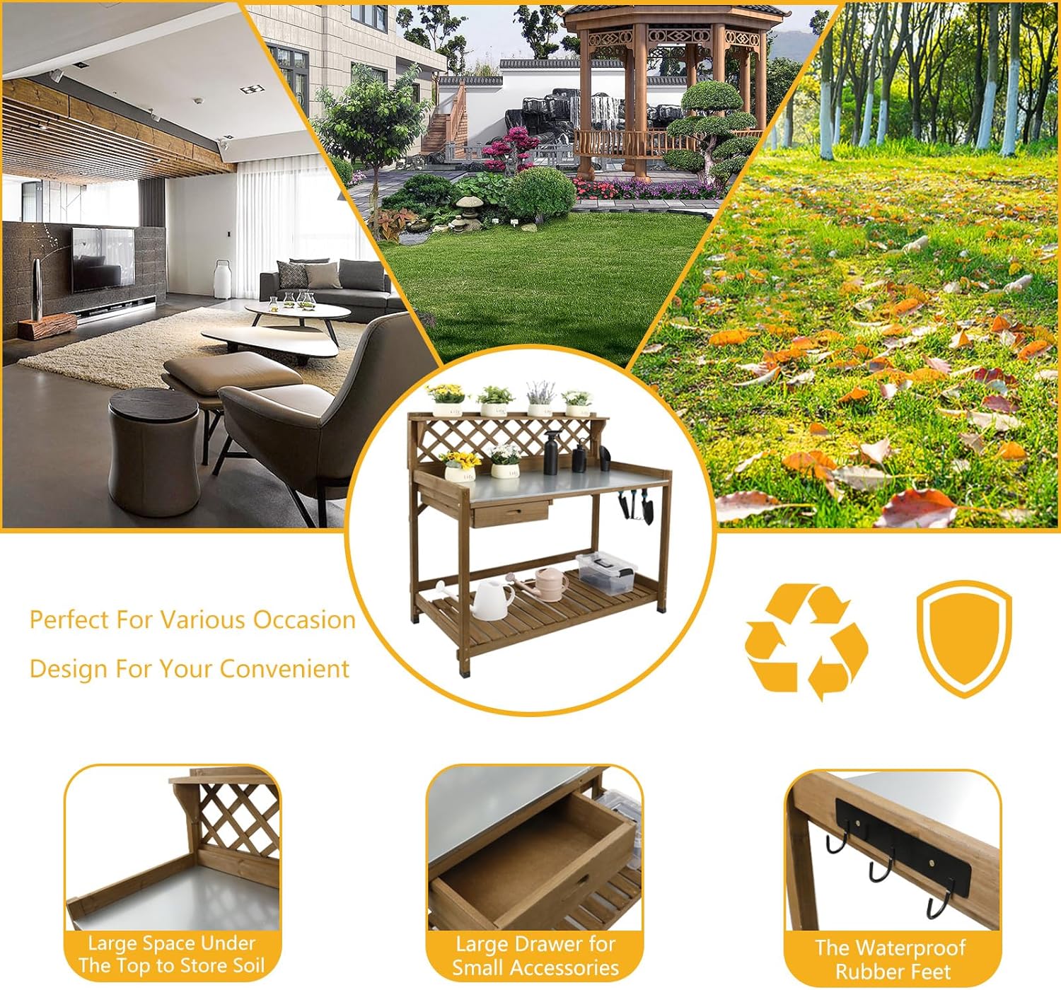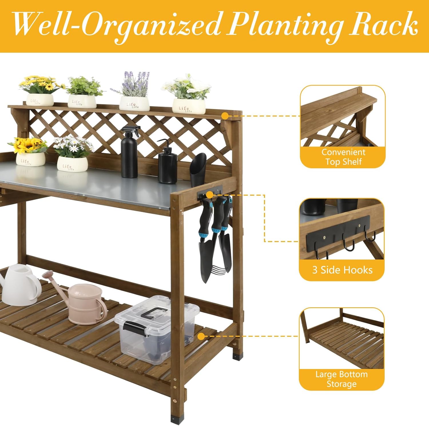 Garden Potting Bench with Metal Tabletop,Outdoor Potting Table Workstation Benches with Drawer/Storage Shelf,Fir Wood Potting Station Work Table with Open Shelf,Lattice Back (Brown)
