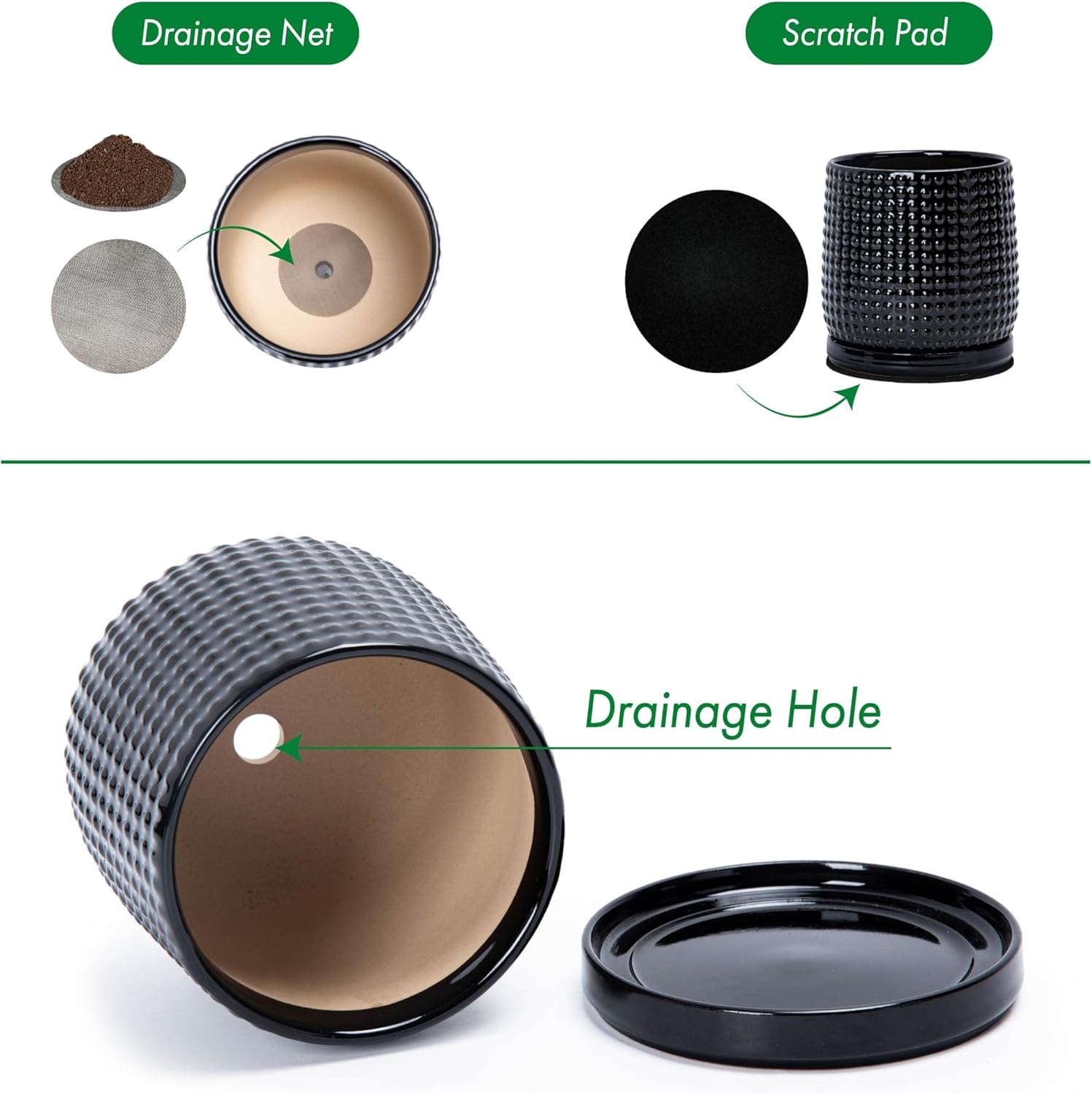 D'vine Dev 6 Inch Ceramic Beaded Stoneware Planter Pot - Flower Pot with Drainage Holes and Saucers for Indoor Succulent Plants or Flowers, Glossy Black, 27-C-X-2