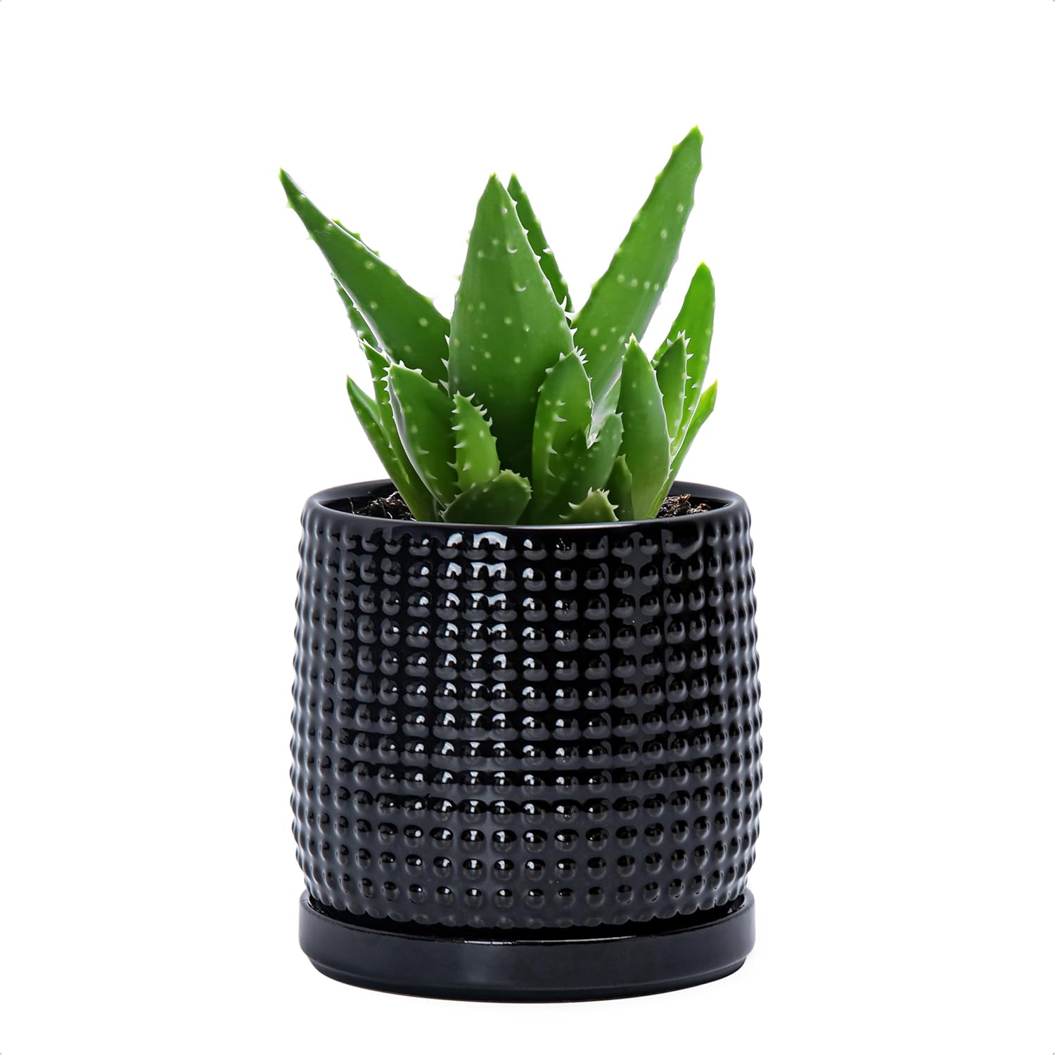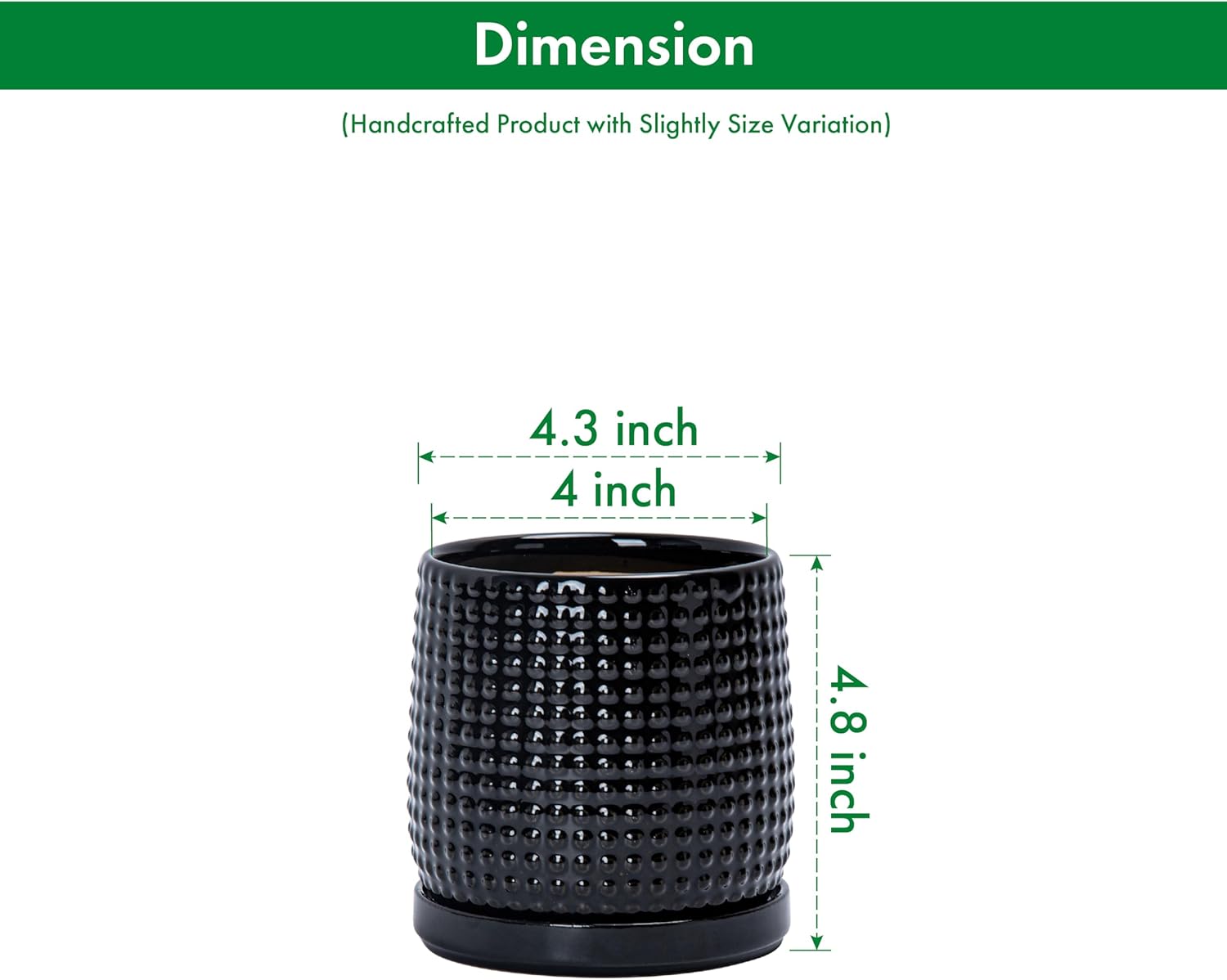D'vine Dev 4 Inch Ceramic Beaded Stoneware Planter Pot - Flower Pot with Drainage Holes and Saucers for Indoor Succulent Plants or Flowers, Glossy Black, 27-C-Z-2