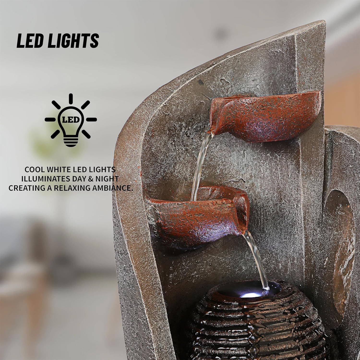 - Transform your outdoor space with our captivating outdoor water fountain. Designed for durability, it adds charm to gardens and patios with the landscape enhanced by potted LED lighting as an elegant focal point. Enjoy the soothing sounds of nature while unwinding outdoors