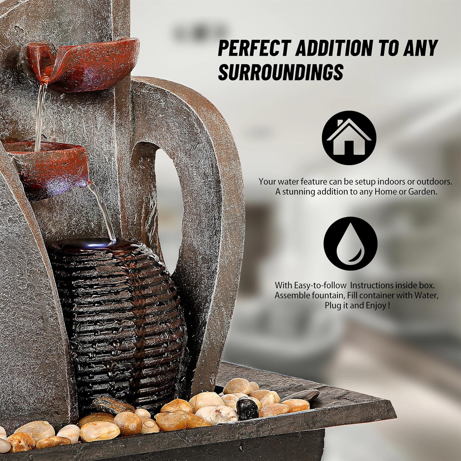 - Elevate your decor with our exquisite tabletop water fountain. Perfect for home office decor, it blends feng shui decor with soothing sounds. Cascading Water fountain pots exquisitely crafted for indoor or outdoor use, it complements any space with its monolithic wall design. Embrace this outdoor table decor with the elegant harmony of indoor fountains and waterfalls