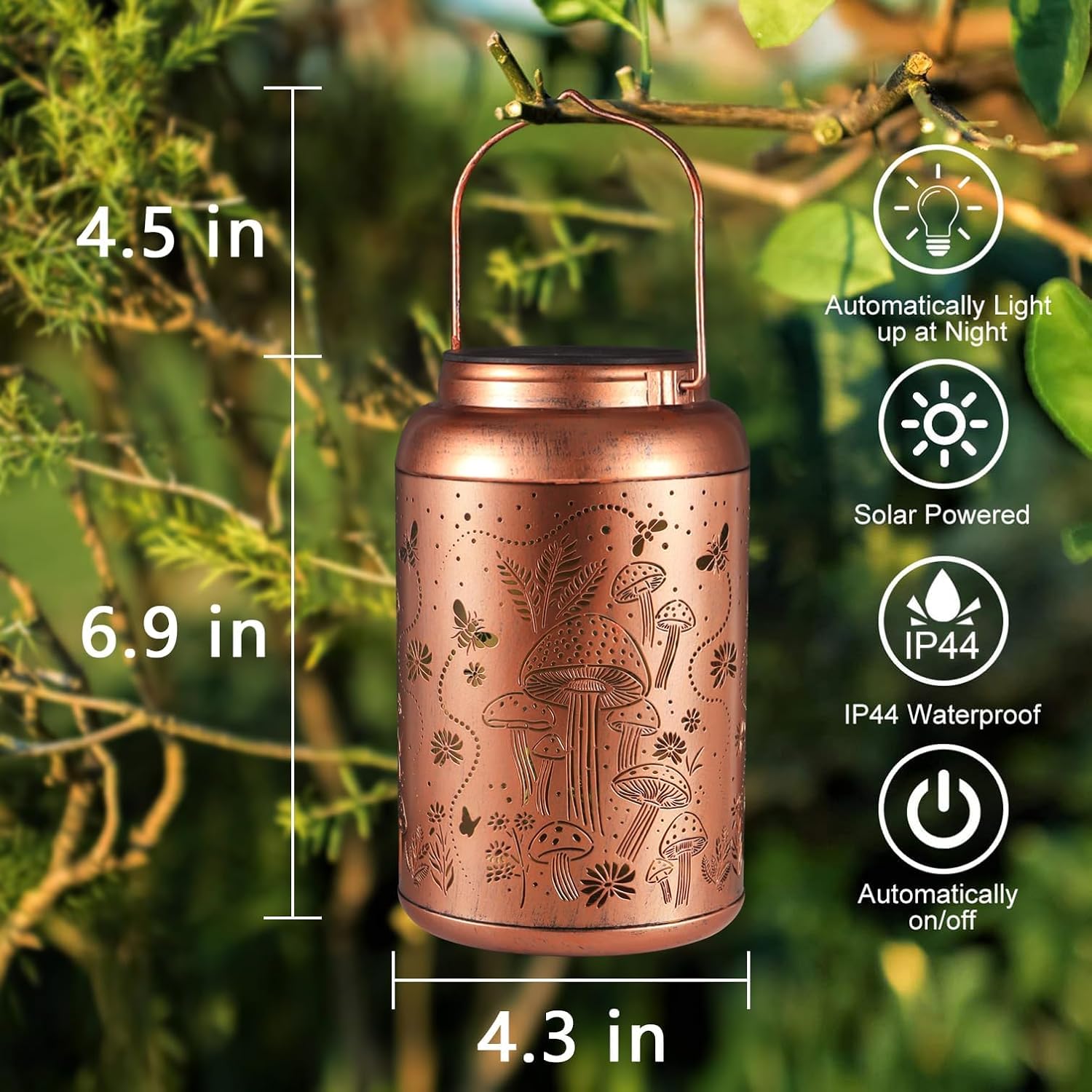 - Graceful Decorative Design:The retro appearance, with gold copper color and hollow out metal veneer, the solar outdoor lanterns casts bright and warm light in darkness, accompanied by gorgeous and graceful Mushroom patterns, adding a beautiful atmosphere to the surrounding environment.