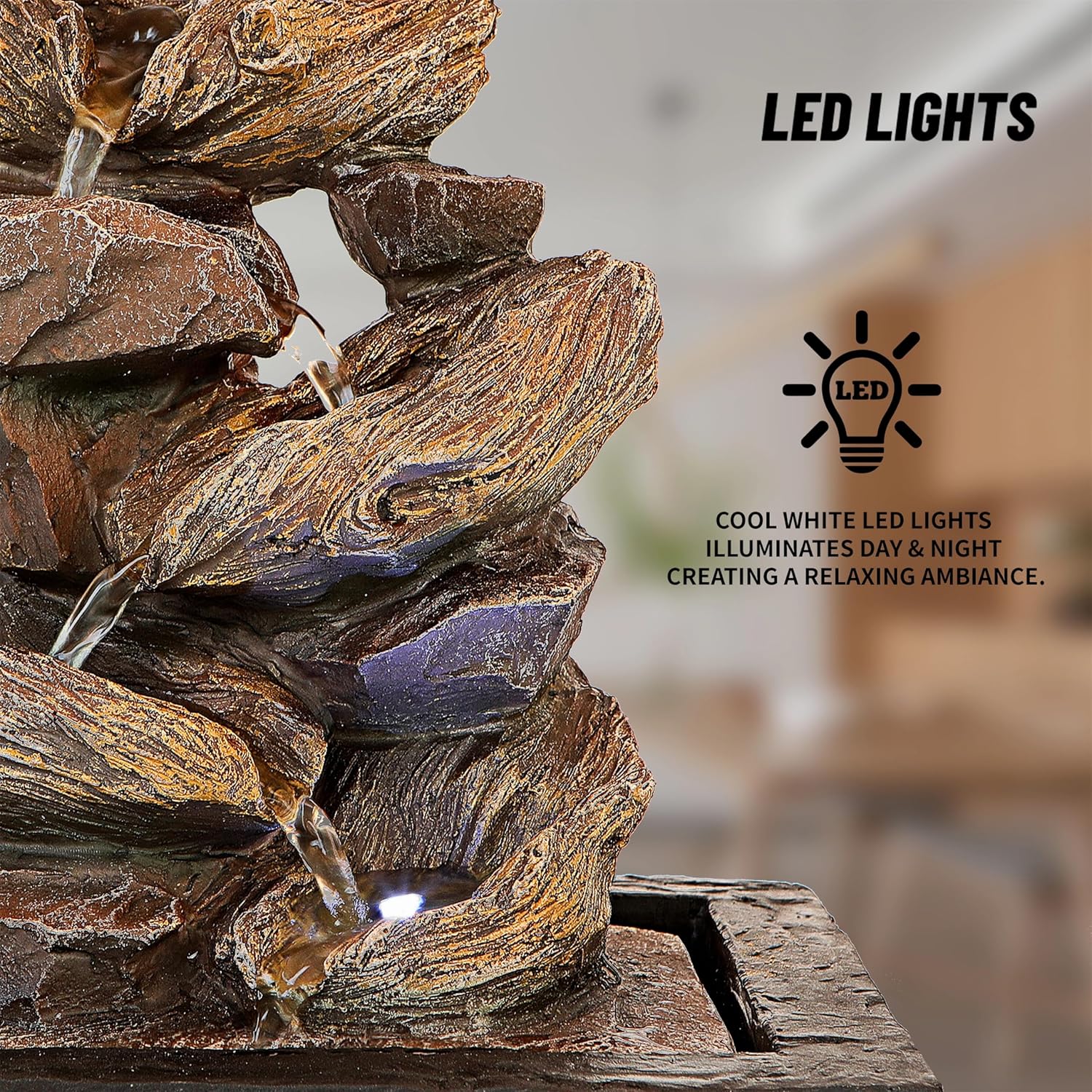 - Special Feature : Cascading nature-type mountain rock waterfall bowls, corded electric LED lighting