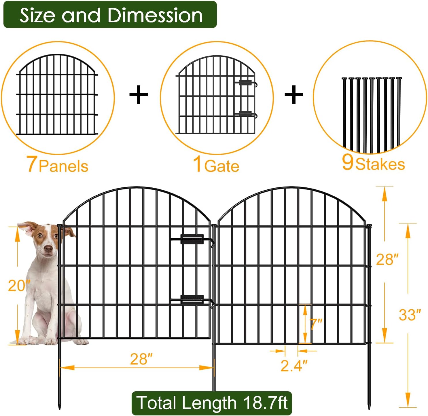- WHAT'S INCLUDED: 1 Gate + 7 Fence Panels + 9 Stakes in a bundle. Gate panel sized 27” (H) x 28” (W), each fence panel sized 28 inch (H) x 28 inch (W), each Stake 33 inches height, linear length 18.7 feet, Black color.
