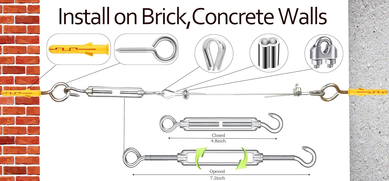 - 【1/8" Turnbuckle Kit 】Suitable for aircraft cable kit, gate tensioner cable kit , Garden Wire for Climbing Plants,Clothesline Wire,String Light Hanging Kit Outdoor, Globe Lights Hanging,Sun Sail Hardware Kit,String Light Suspension Kit , Curtain Cable Wire System,Guide Wire for Outdoor String Lights ,Outdoor Applications of Tent Rope, Deck Cable Railing and etc.