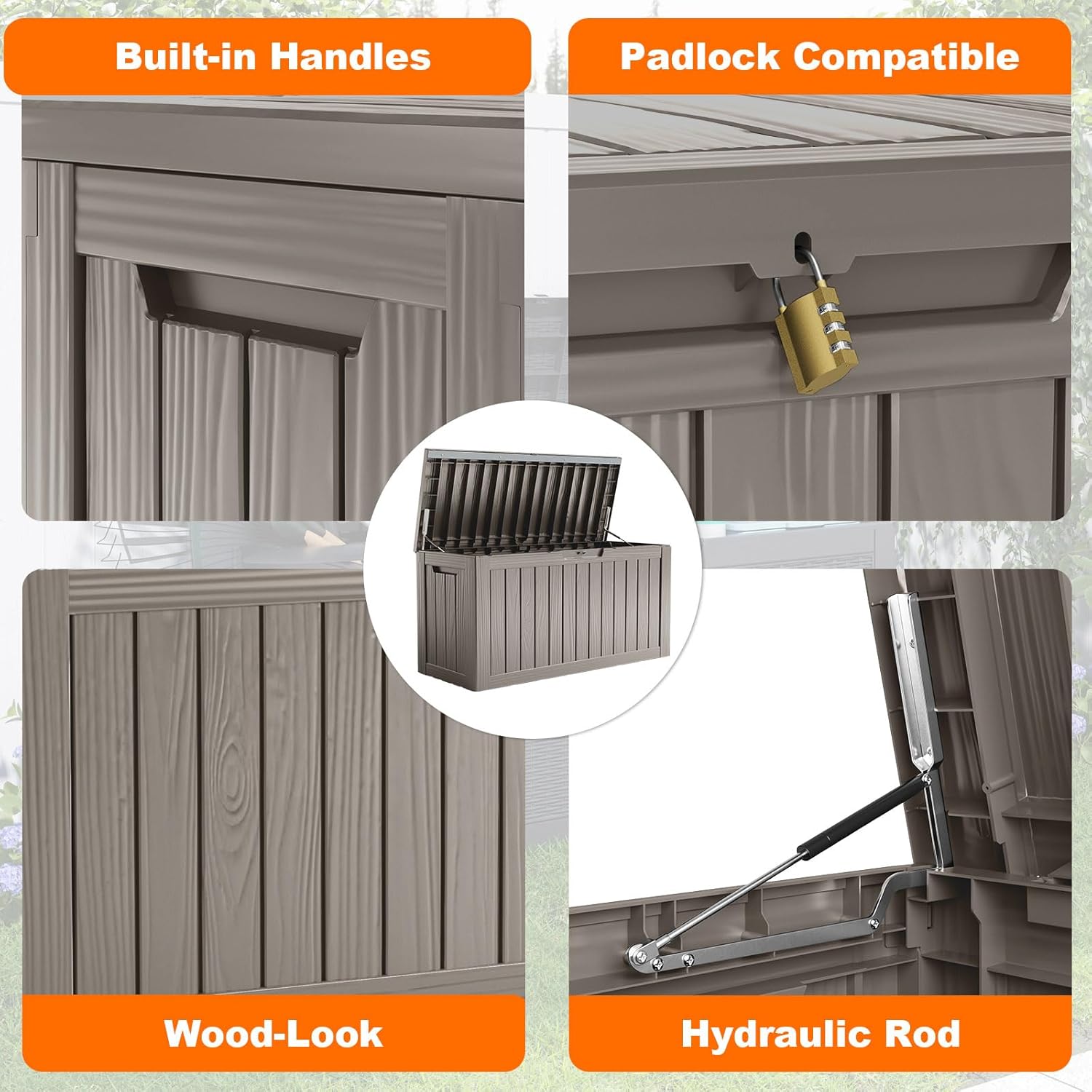 - CONVENIENT DESIGN: Our deck storage box features built-in handles on both sides for easy lifting and mobility. Additionally, you can enhance security by adding a password lock/small lock (not included) to the top cover