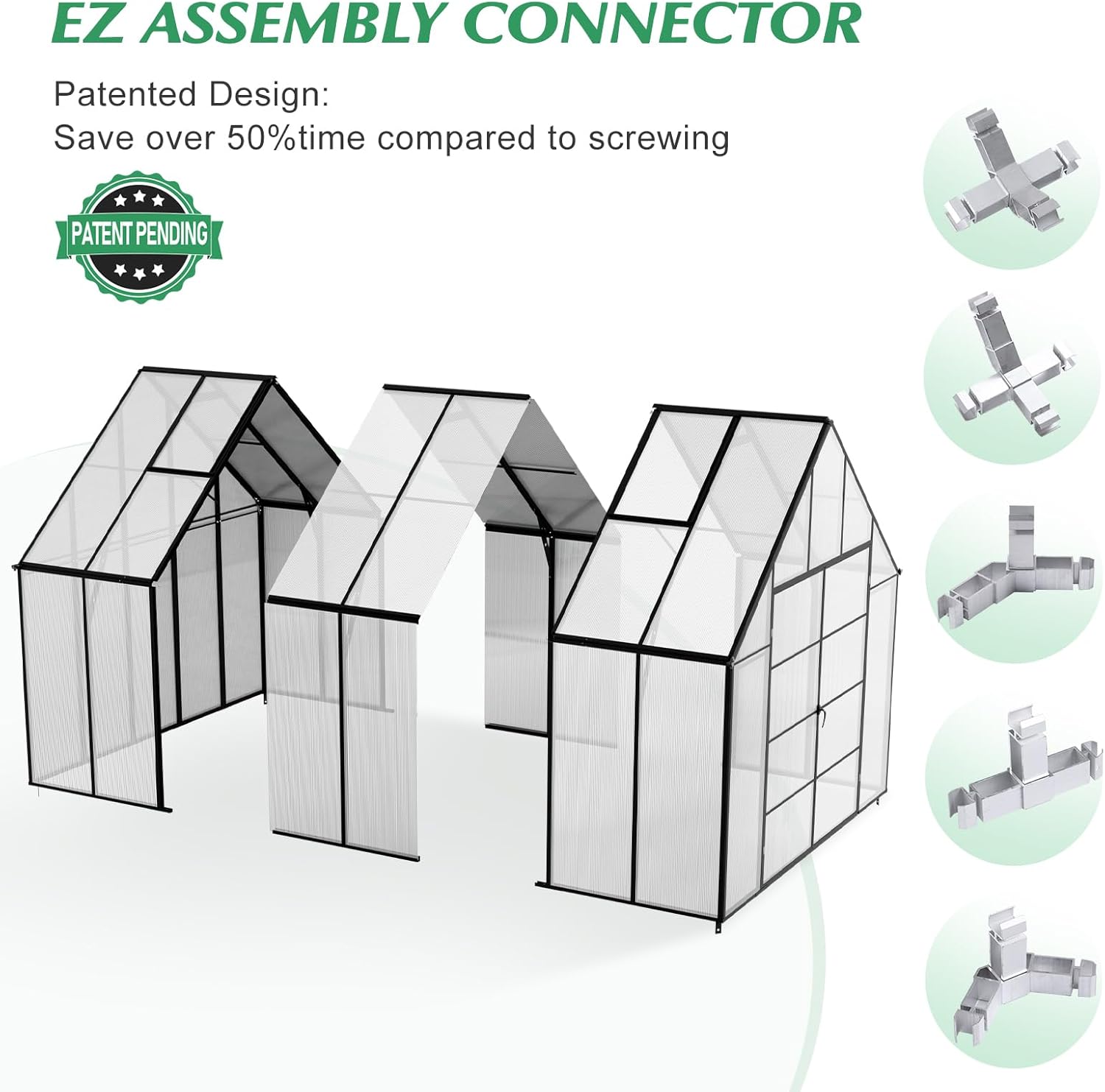 - 🌻【Quick & Easy Assembly】Our upgraded polycarbonate greenhouse designed with quick-fit connectors,adults can complete the installation within 4 hours. This greenhouse with modular design can be put together directly, the parts to be very precisely machined and they all fit together perfectly including where the holes were drilled.