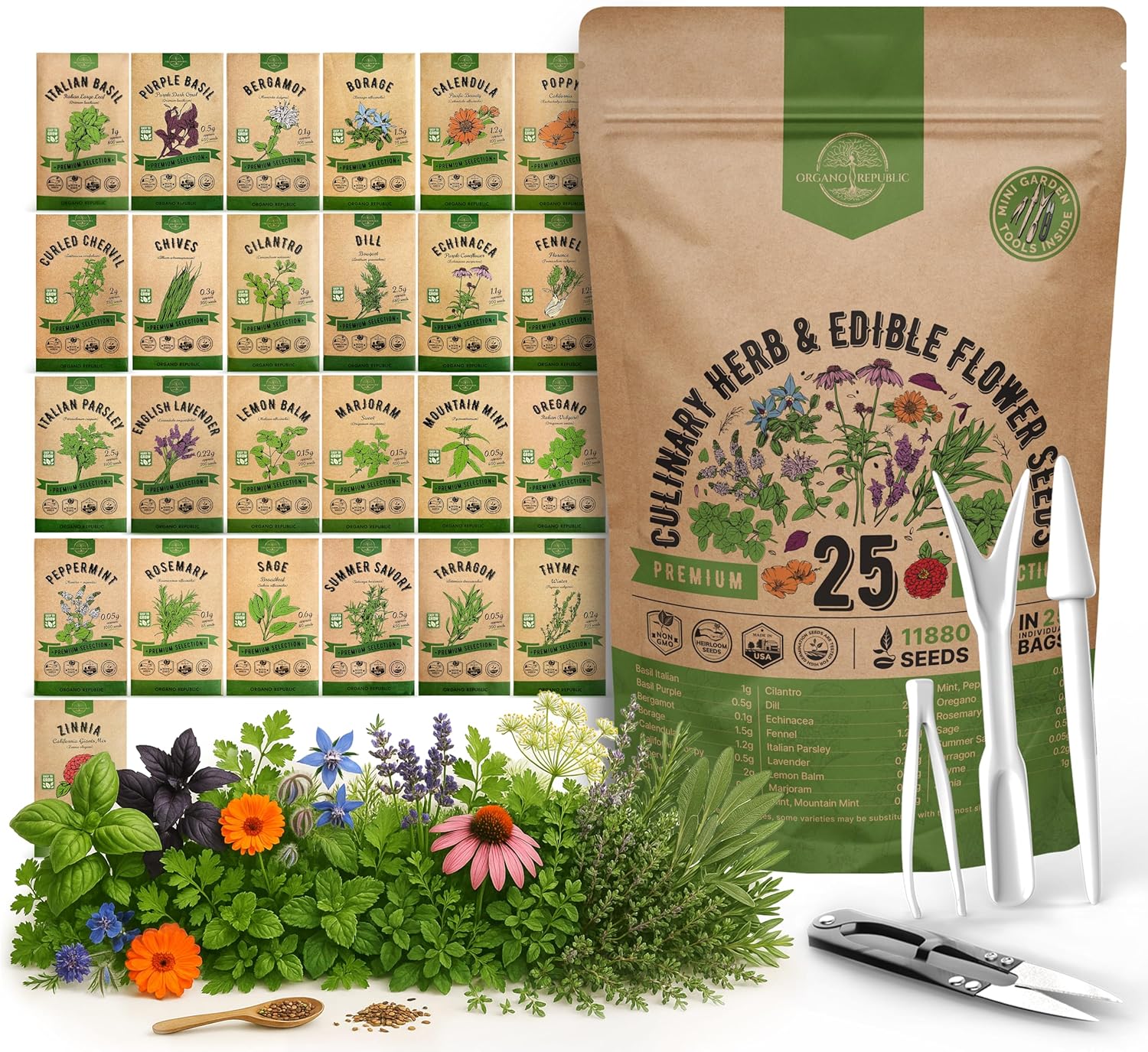 - Gardening Kit: 25 Culinary Herbs & Edible Flower Seeds Variety Pack NON GMO Heirloom Seeds LESS THAN $1.20 PER SEED VARIETY PACK 11,900+ seeds including: Basil Italian, Basil Purple, Bergamot, Borage, Calendula, California Poppy, Chervil, Chives, Cilantro, Dill, Echinacea, Fennel, Italian Parsley, Lavender, Lemon Balm, Marjoram, Mountain Mint, Peppermint, Oregano, Rosemary, Sage, Summer Savory, Tarragon, Thyme, Zinnia.