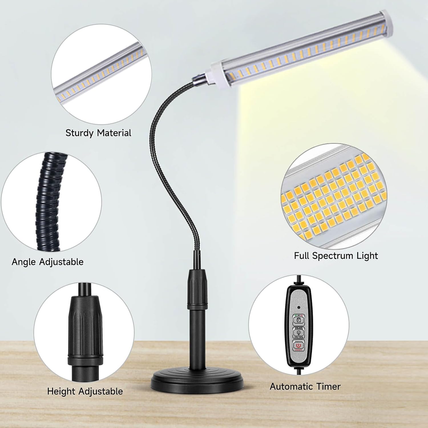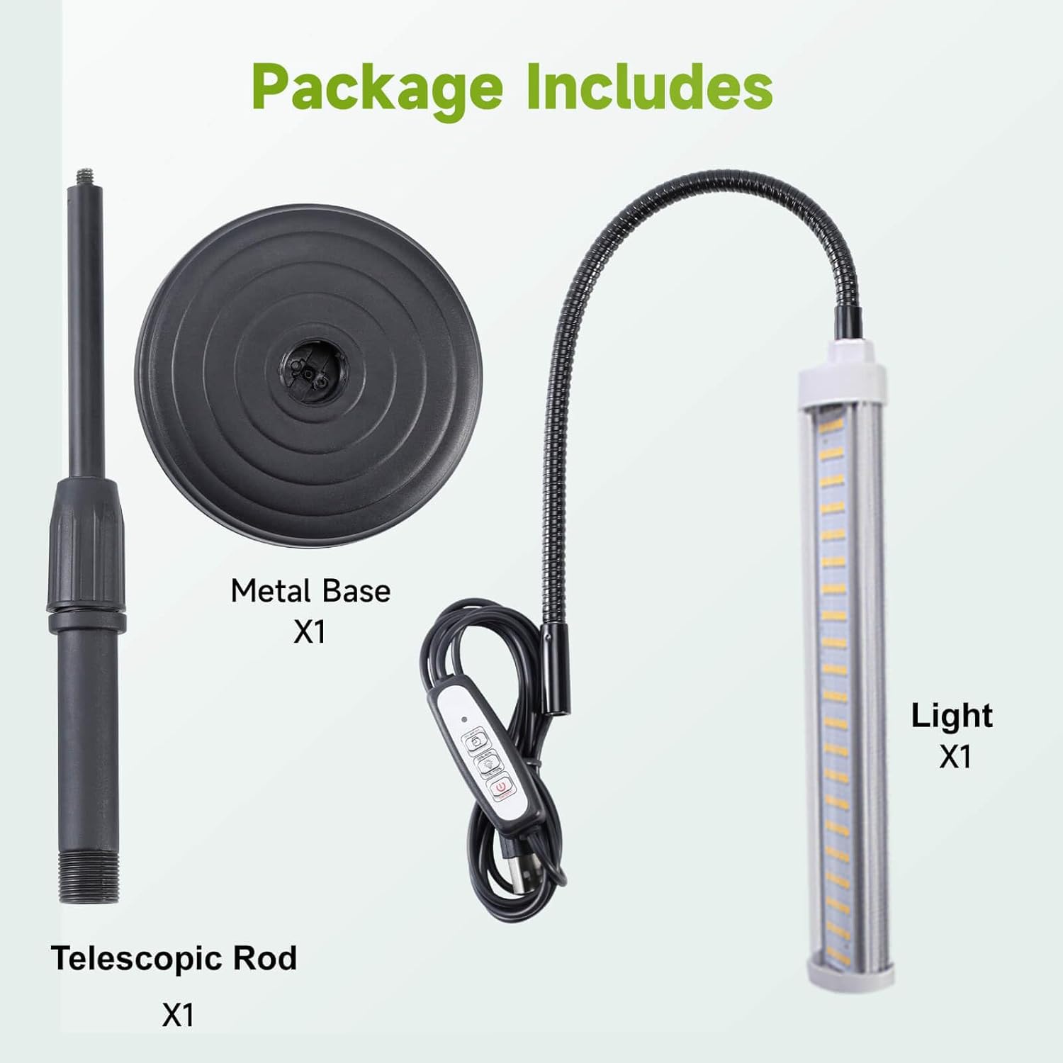- Easy to Install - With flexible Gooseneck & Solid Base ,Height Adjustable Min 13-Max 18 Inch ,the plant light allows you to place the growth light in any desktop or countertop without fall to provide the best lighting angle for your plants,meet the cover around the plant.Powered by USB or AC Power Plug,