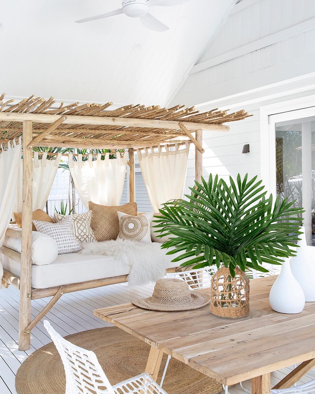 - [Premium Artificial Plant] -6 big and dense palm leaves decor in a glass bottle vase with faux water in order to finalize the design, the hemp rope creates a chic tropical style to this fake potted plant.