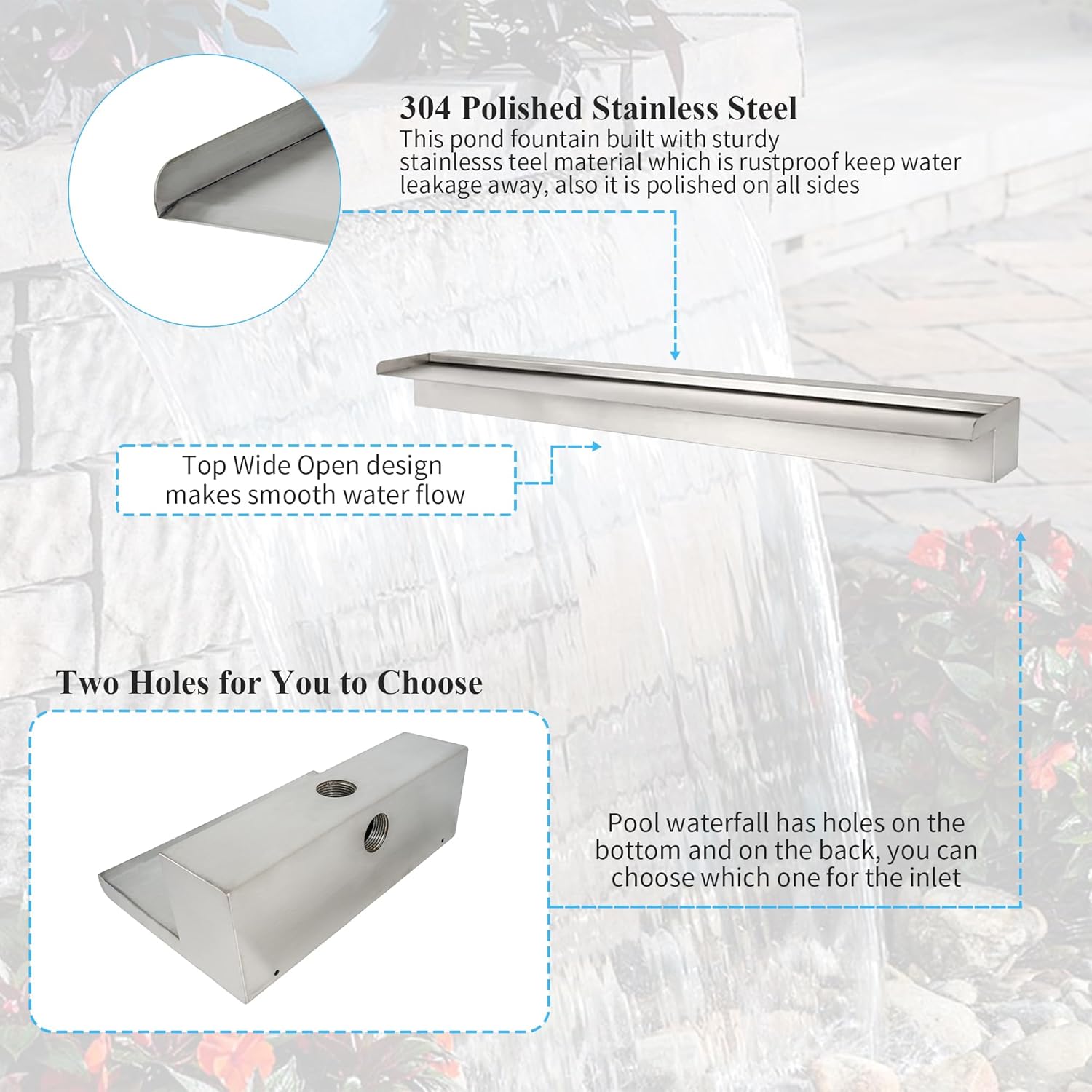 - Premium 304 stainless steel: The waterfall spillway is made of finely polished stainless steel material with tightly integrated welds that are strong and rustproof. There is no chance of water leakage. It can serve you for a long time without daily maintenance. NOTE: The stainless steel product will produce yellow spots (not rust) when in contact with water. You can wipe the stains with a rag. The cloth and product should be dry before wiping.