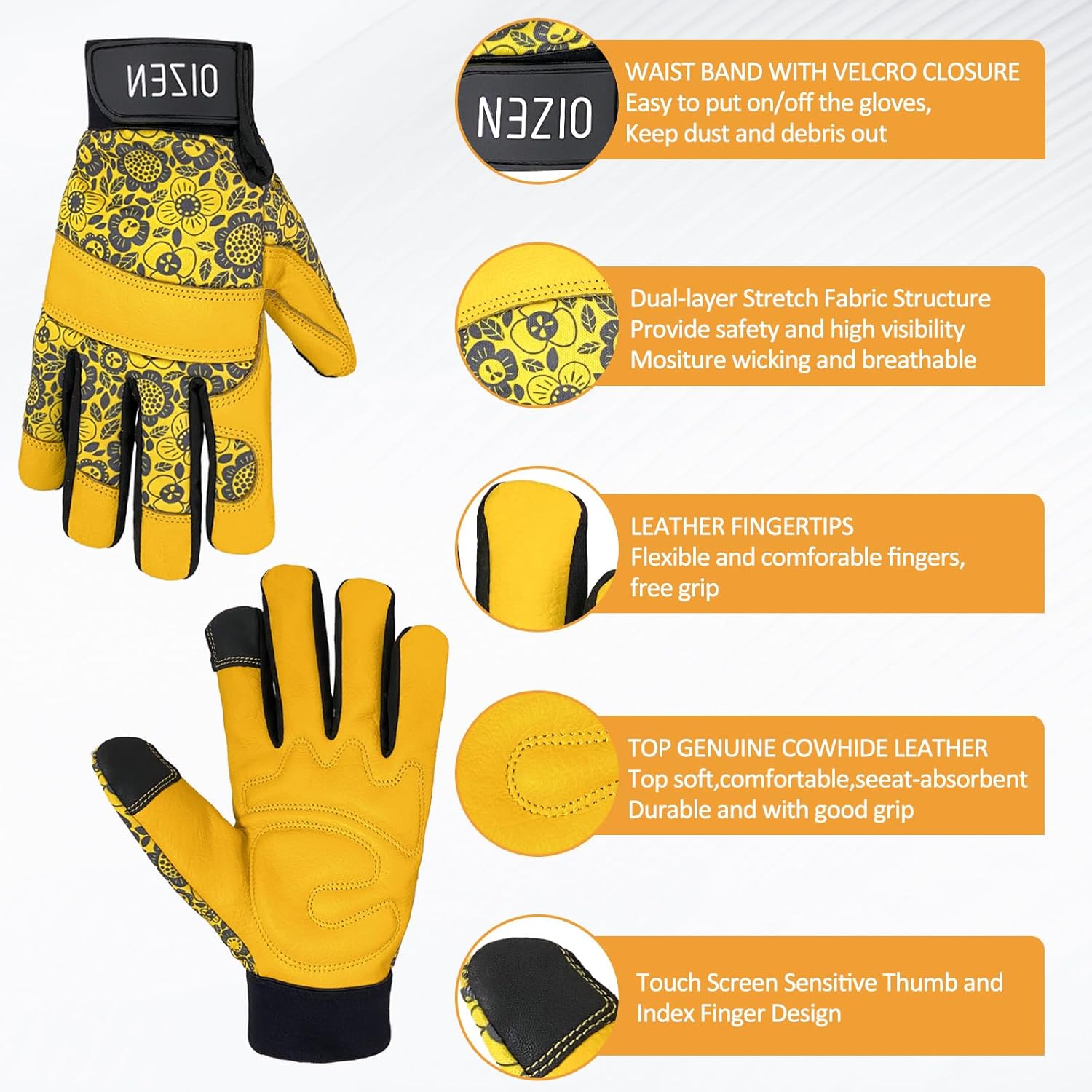 - Ergonomics Design: Stretchable double-layer spandex back keep your hands flexible, breathable & comfortable on the job. Cowhide leather with foam padded palm and reinforced fingertips increase durability. Supportive adjustable with hook & loop strips closure cuff for snug secure fit.