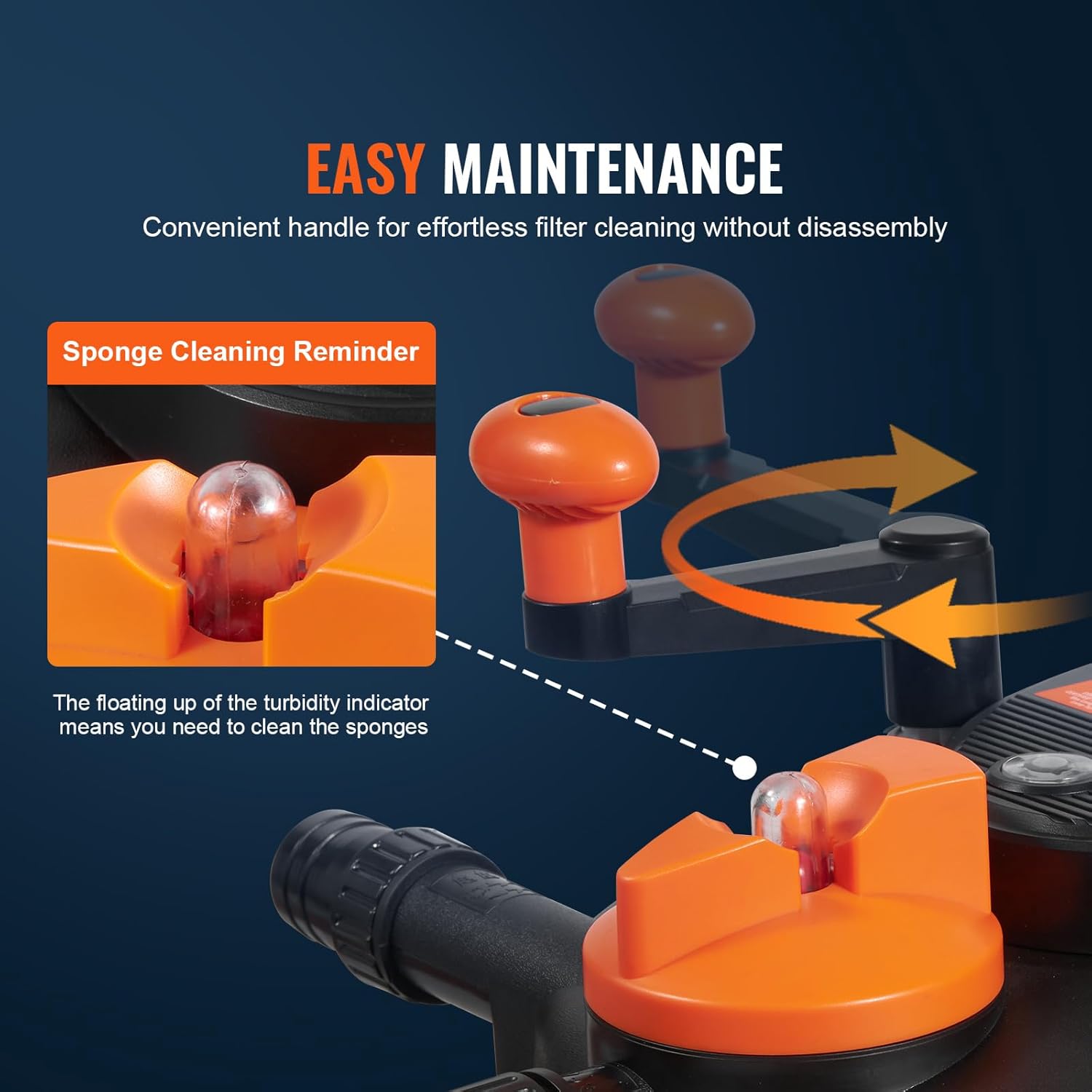 - Cleaning Made Simple: Our pond pressure bio filter sports a crank handle on top, making it easy to clean the filter with the internal cleaning rod. When the top turbidity indicator floats up, it's time to freshen up your filter sponge – no fuss, no opening the container. Plus, both sponge and bulb are replaceable for your convenience.