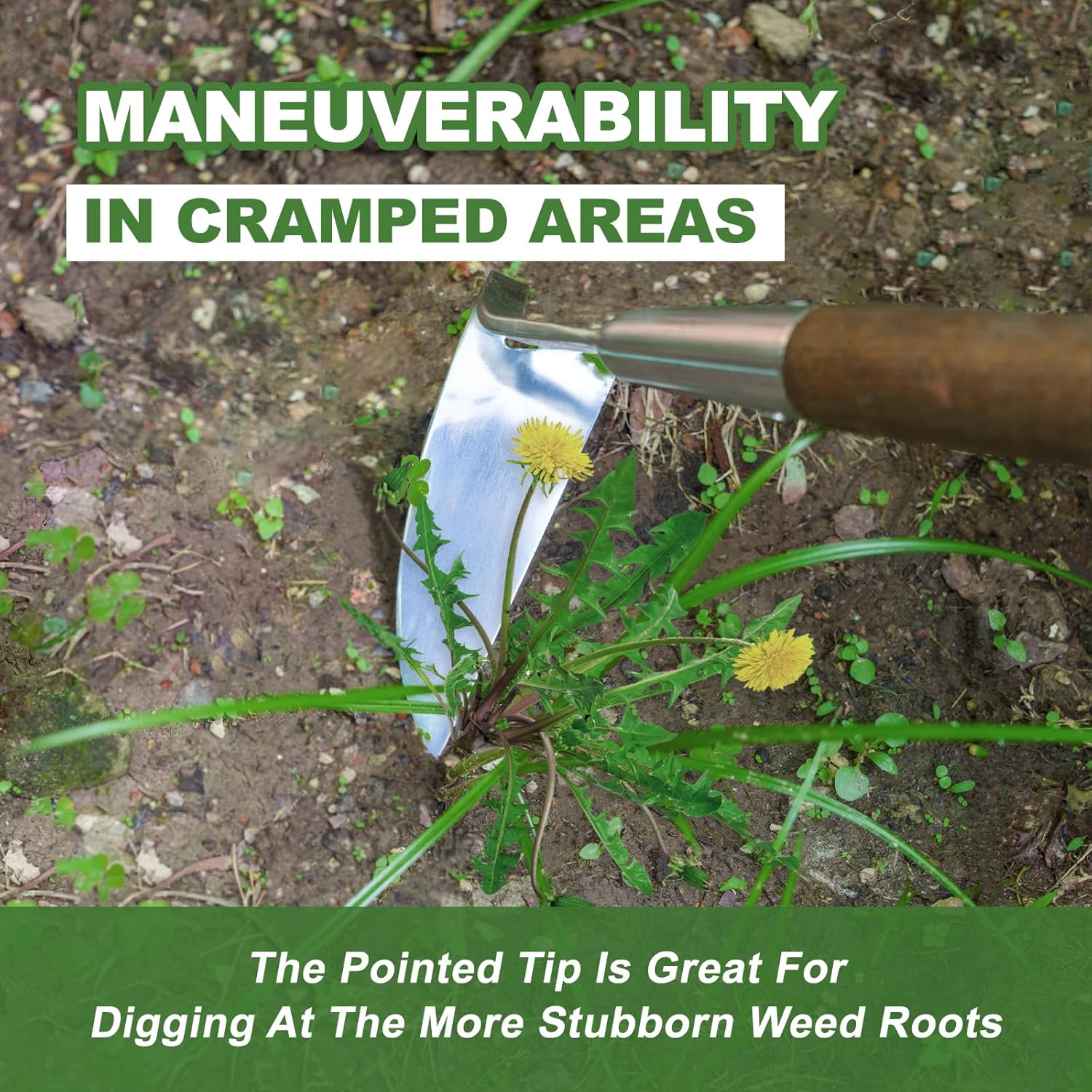 • 【Special Elbow Design】The gardening sickle hoe has a special elbow design, which makes it so much easier to clear the weeds. The unique angle design makes it easy for the hoe to quickly scrape shallow weeds with a sharp flat blade, and a sharp tip allows you to easily chop deep to get to roots.