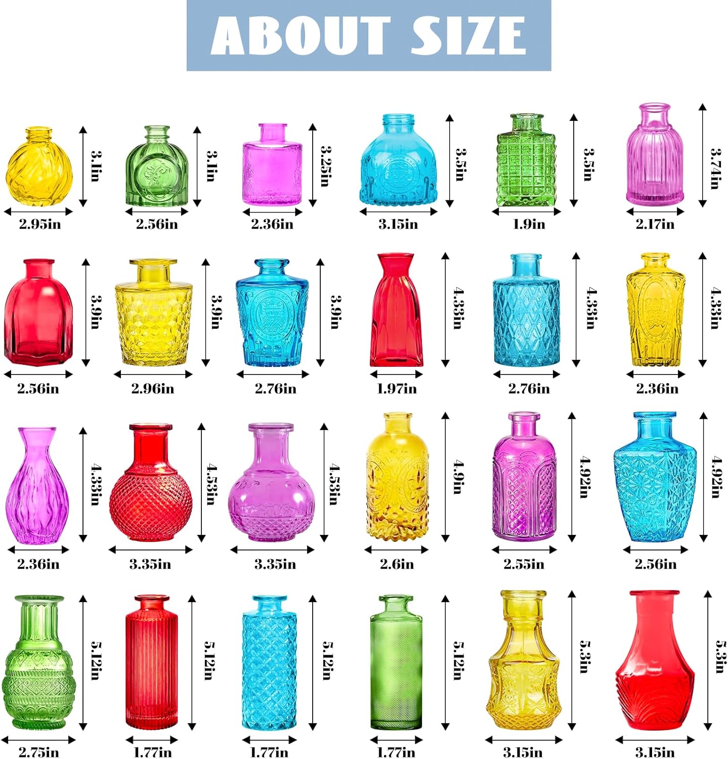 - Different Retro Designs: The set contains 24 small bud vases in bulk with different sizes, shapes and styles. The surface of mini vases bud vases in bulk are all embossed, exquisite, beautiful, unique and textured, and sparkles under the light. Note: Actual colors may vary slightly due to different monitors and lighting.