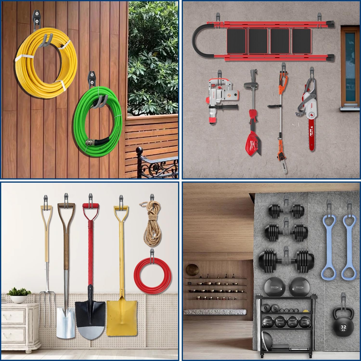 - Multi-Use Hose Hanger Wall Mount: You will receive 4 sturdy hose reel wall mount and 1 extension cord storage straps. This steel wall mount hose reel, ideal for organizing gardens, shops, sheds, yards, and garages, keeps various tools in order, thereby saving you more space. Our outdoor hose holder is suitable for hanging items such as cables, air hoses, ladders, chairs, brooms, shovels, and power tools