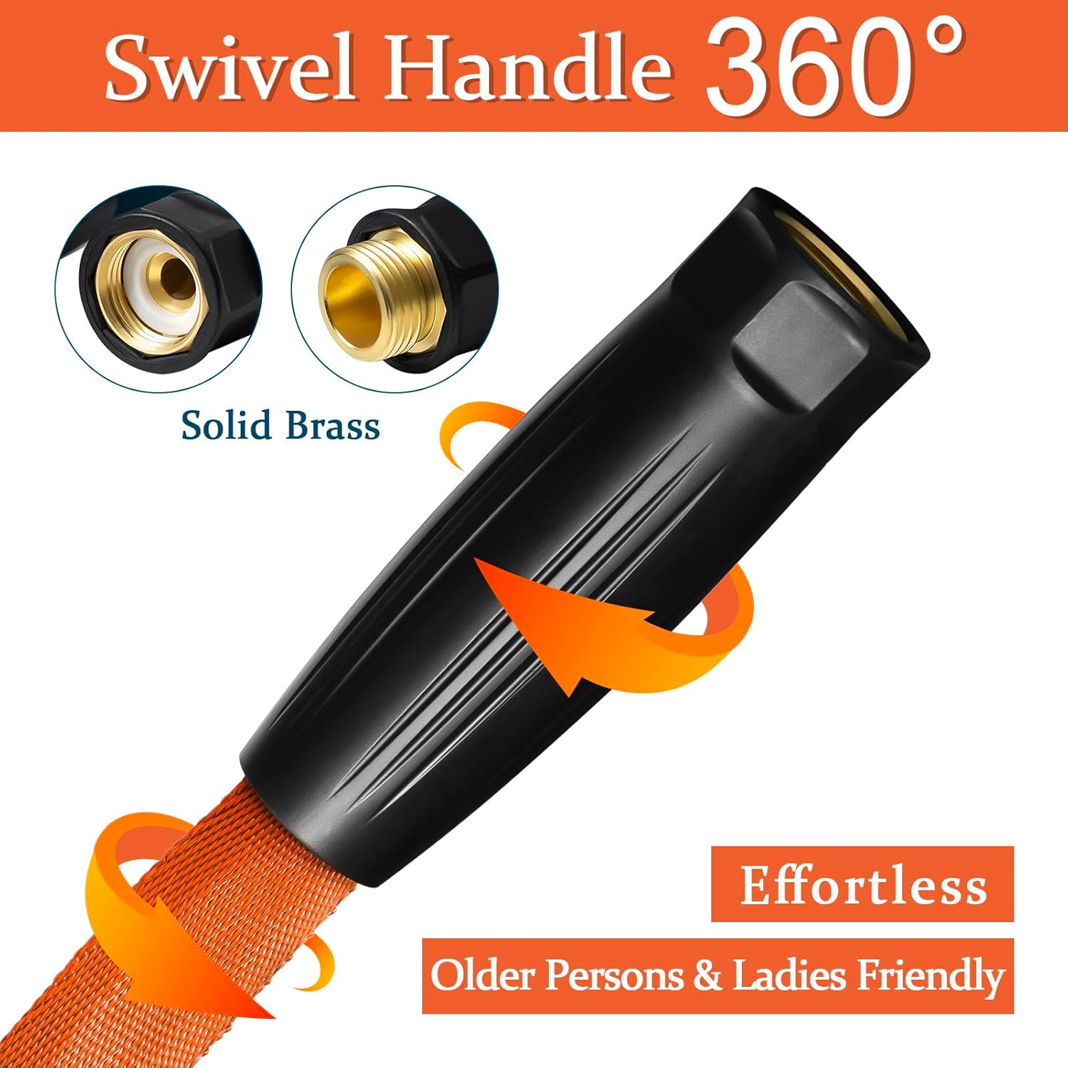 - [ Swivel-Handle & Effortless ] The movable handle allows the hose to rotate freely without twisting the entire hose to prevent twisting. The handle can also fix the brass fitting to make the connection with faucet/nozzle/sprinkler more easily and effortlessly.