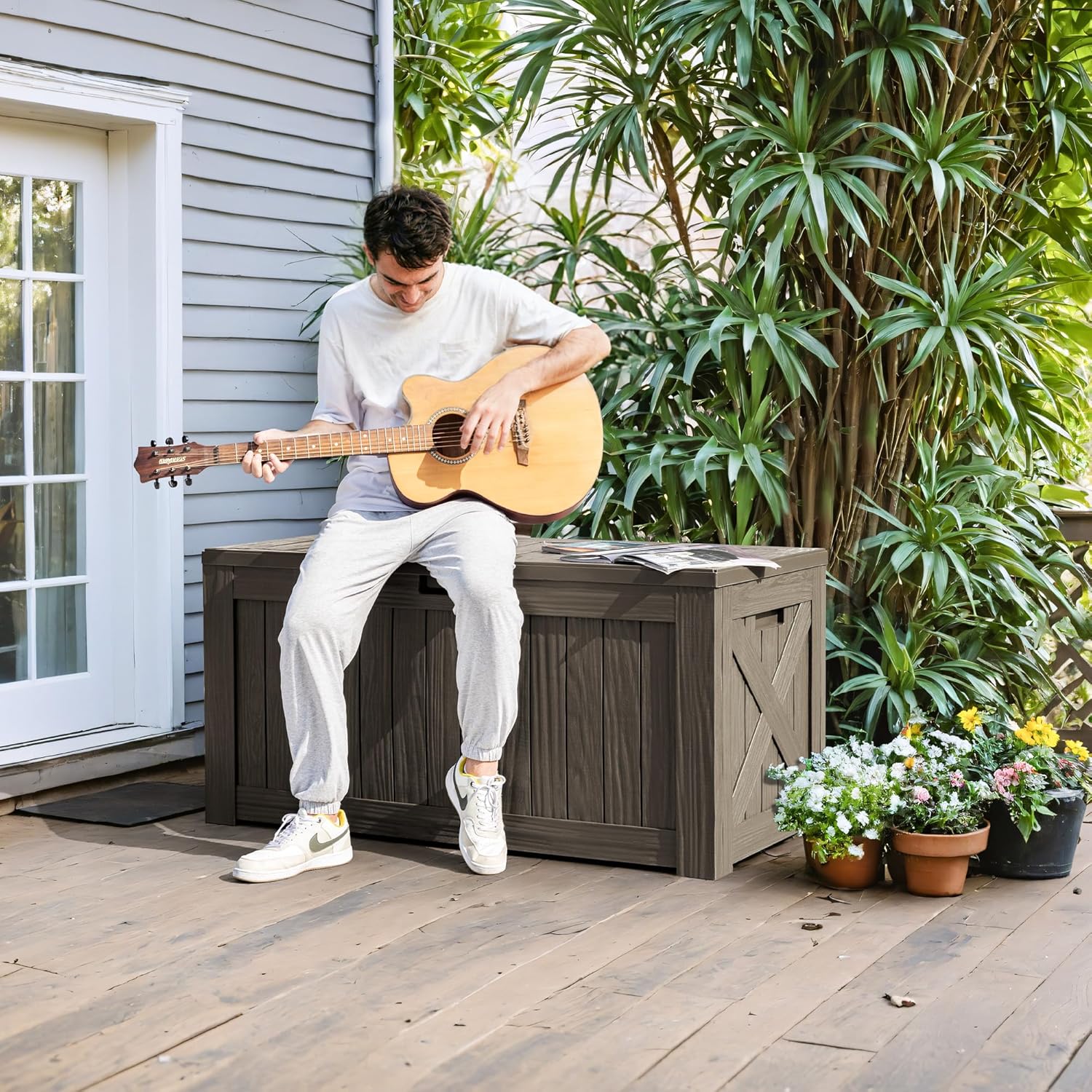 Greesum 120 Gallon Deck Box, Resin Outdoor Storage Container for Patio Furniture, Garden Tools, Pool Accessories, Weatherproof, Lockable, Coffee
