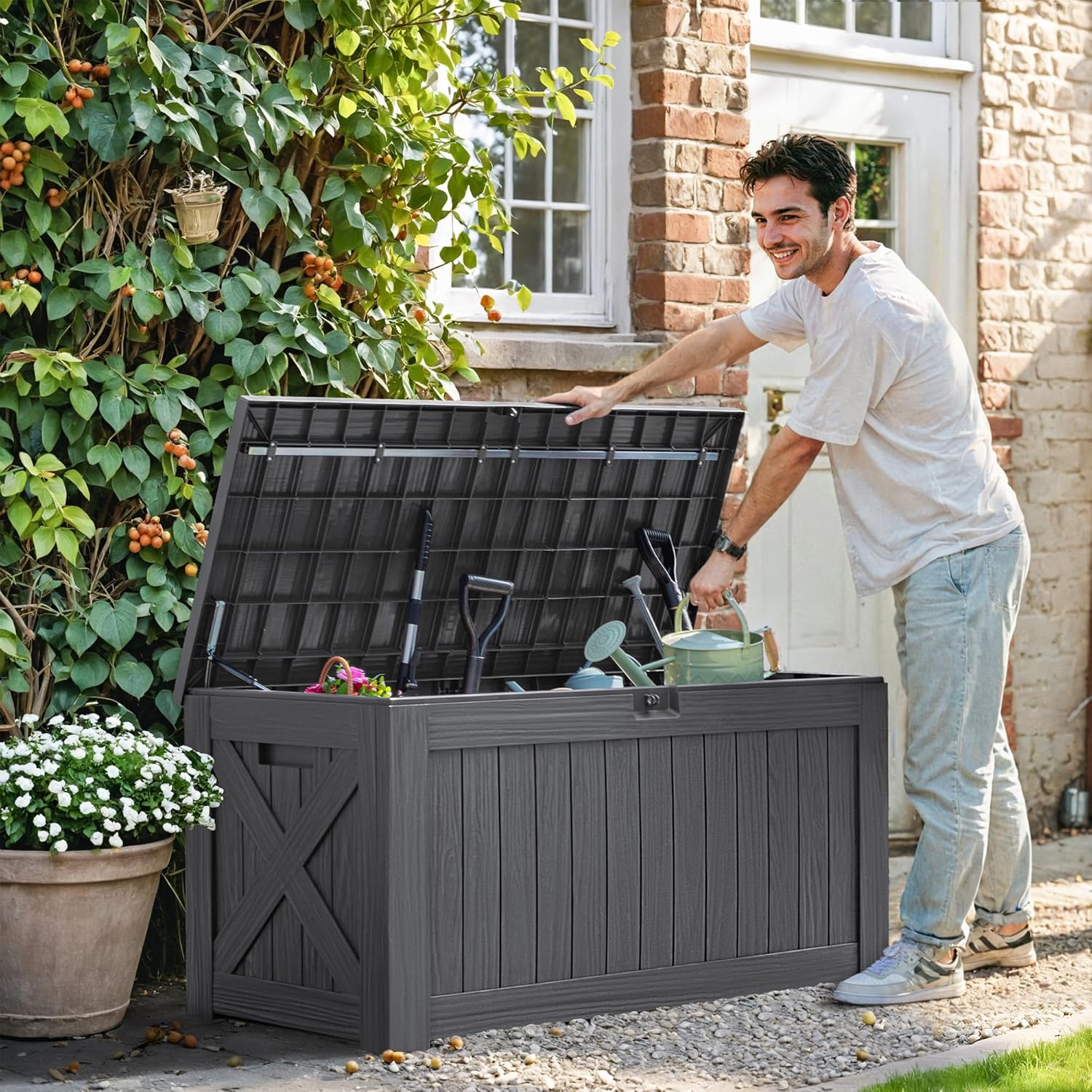 - Large Storage Capacity: The storage box is in 52.3β(L) x 24.2β(W) x 25.4β(H), and it has 120 gallons of storage space, which can perfectly place your garden tools, pool gear and etc, make sure your space looks clean and tidy.